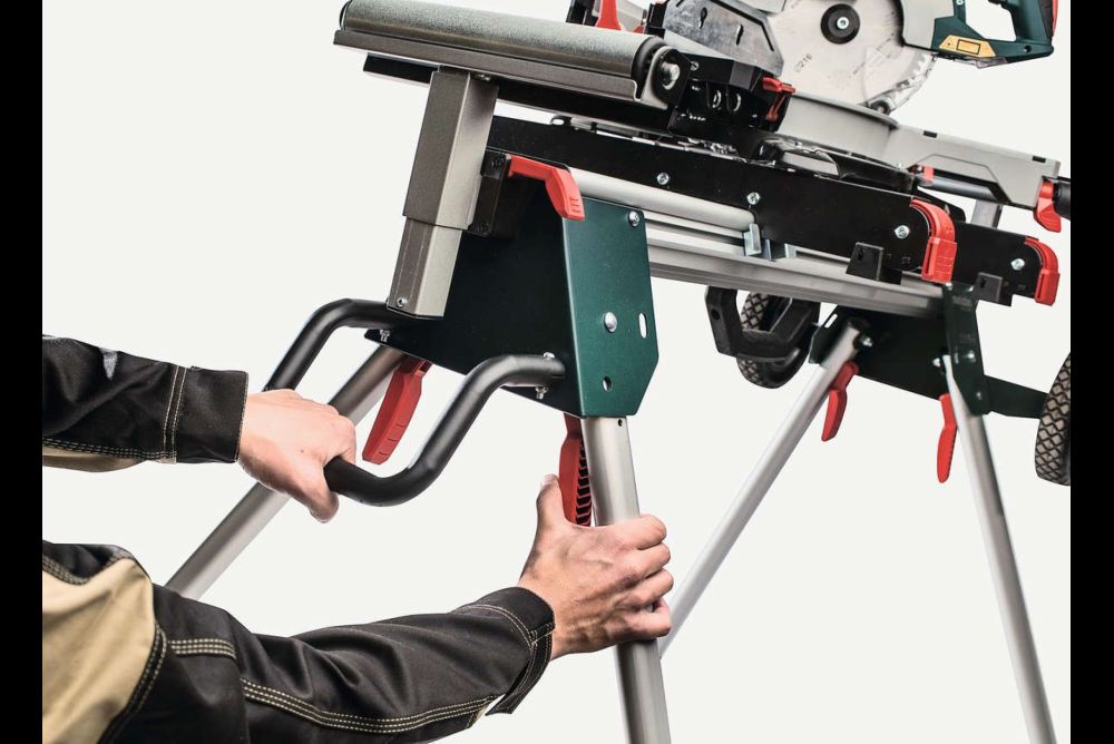 Für Handwerker, die regelmässig schwere Kappsägen auf die Baustelle transportieren müssen, bietet Metabo mit seinen beiden neuen Untergestellen «KSU 401» und «KSU 251» eine gute Lösung. Auf den leichten und robusten Gestellen lassen sich sämtliche Metabo-Kappsägen sowie alle gängigen Modelle anderer namhafter Hersteller schnell und werkzeuglos montieren. Mit dem baustellentauglichen und treppengängigen Fahrwerk, den grossen Griffen und der Möglichkeit, die Standbeine einhändig einzuklappen, hat die Firma die Untergestelle für den Transport optimiert. Auch mit montierter Säge lassen sich die Gestelle mit wenigen Handgriffen zusammenklappen, bequem zum Arbeitsort ziehen und vor Ort schnell wieder aufstellen. Sie sind robust, stabil und halten bis zu 250 kg Gewicht aus. Auch besonders schwere, lange und breite Werkstücke kann der Anwender auf der Baustelle oder in der Werkstatt so bequem im Stehen zusägen. Die beidseitigen Materialauflagen mit Rollen lassen sich beim «KSU 251» auf eine Länge von bis zu 2,5 m ausziehen, beim «KSU 401» sind es bis zu 4 m. Für Serienschnitte kann der Anwender links und rechts den Abläng-anschlag nutzen.