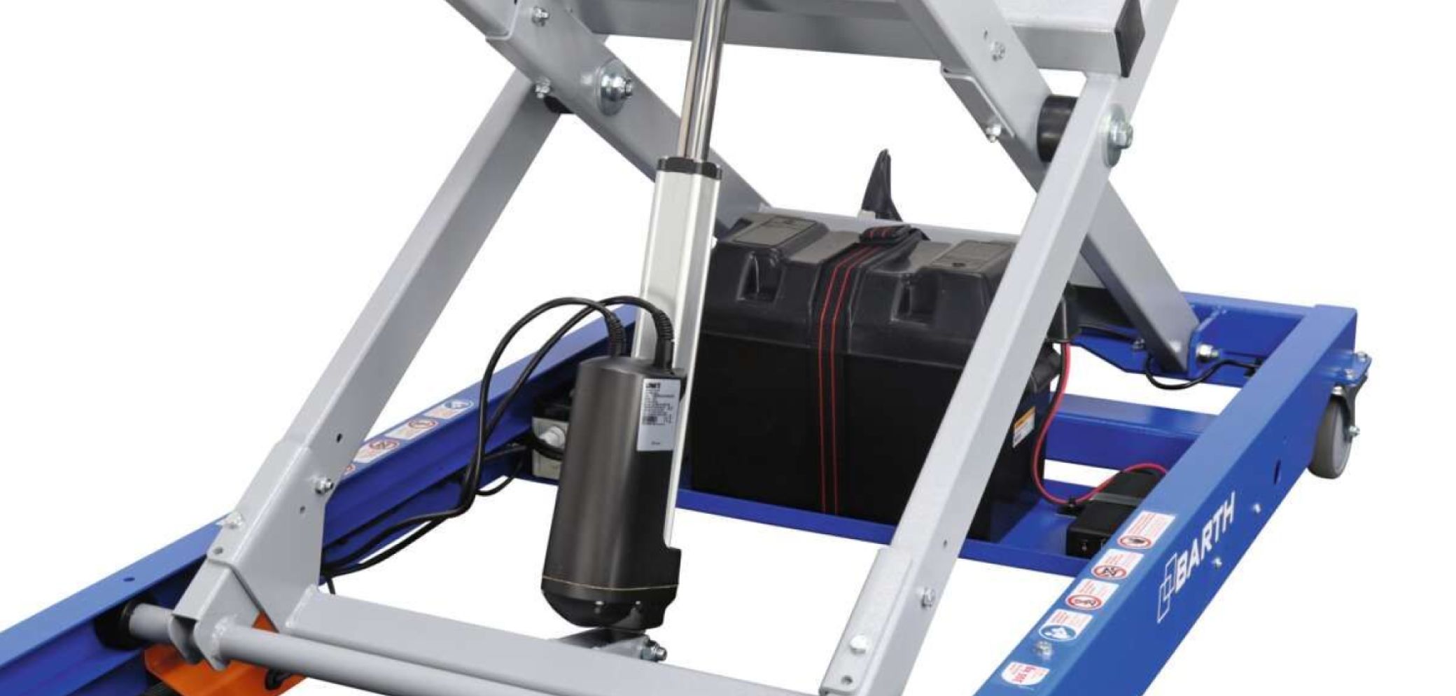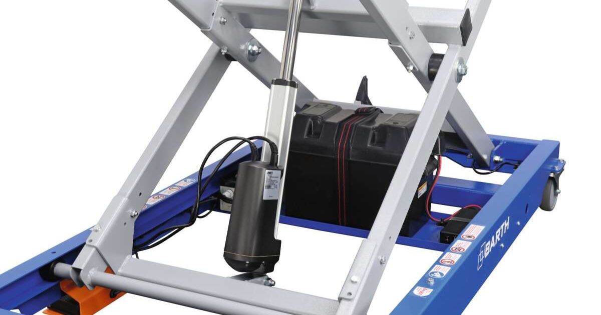 Bei dem Scherenhubtisch «SHT300E» der Ing. R. Ment AG liefert eine handelsübliche Fahrzeugbatterie die Energie für den 12-V-Antrieb der Hydraulikpumpe.