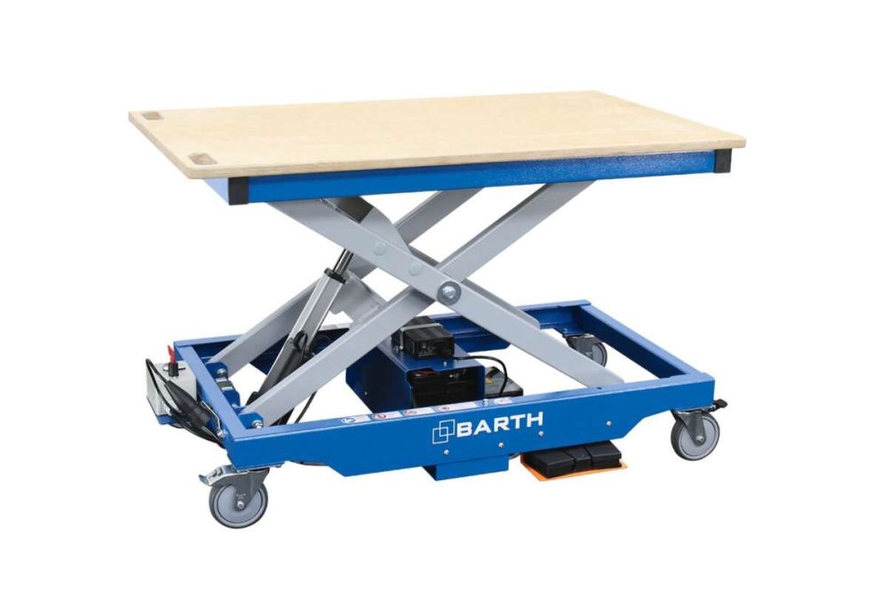 Bei dem Hubtisch «H 400» der Barth GmbH erfolgt die Höhenverstellung wahlweise per manueller Fusshydraulik oder mit einem elektrischen Hydraulikaggregat. In der Ausführung mit der Fusspumpe hat der Tisch eine Nutzlast von 400 kg, und bei den Versionen «eDrive» und «accuDrive» mit der elektrischen Höhenverstellung beträgt die maximale Belastung 300 kg.