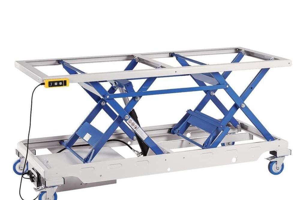 Typischerweise besteht ein Scherenhubtisch aus einer oberen und einer unteren Plattform, einem Hubantrieb und einer stabilen Scherenkonstruktion. Eine kostengünstige Variante stellt dabei die manuelle Höhenverstellung per Fusspedal dar. Eine solche manuell-hydraulische Lösung ist einfach zu bedienen und unabhängig von einer Stromquelle. Alternativ kann auch ein elektrohydraulischer Antrieb zum Einsatz kommen. Ein Hubtisch mit einem solchen Antrieb muss aber permanent an eine Stromquelle angeschlossen sein, was ihn für den mobilen Einsatz weniger geeignet macht. Dafür kann die Tischhöhe stufenlos und bequem per Knopfdruck oder Fusstaster eingestellt werden. Besonders wenn die Höhe des Tisches oft verstellt wird, kann eine elektrische Höhenverstellung die Bedienung somit erleichtern.