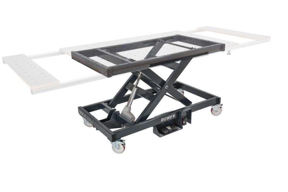 Das Untergestell «400 XL Akku» von Ruwi ist für eine Belastung bis 400 kg ausgelegt. Gegenüber den Felder-Hubtischen ist das ein Plus von 100 kg, obschon die Untergestelle nahezu baugleich sind. Da die Belastung auf das Hydrauliksystem vor allem in den tiefsten Tischpositionen am höchsten sei, könne durch eine Begrenzung der minimalen Tischhöhe und auch ohne wesentliche Änderungen in der Konstruktion eine Nutzlast von 400 kg garantiert werden, wie das Unternehmen vermeldet. Dies wirkt sich allerdings zulasten von 150 mm Hubweg aus. So kann das Untergestell von Ruwi «nur» noch zwischen 690 und 1035 mm verfahren werden.