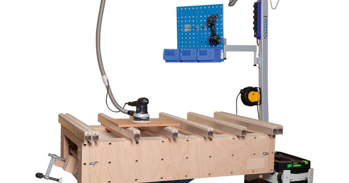 Die Firma Montagetische Einemann hat sich auf die speziellen Anforderungen des Holz verarbeitenden Handwerks spezialisiert. Die Montagetische können neu mit dem «Multi Schwenkarm MSA» ausgestat- tet werden. Der Schwenkarm ermöglicht es, Kabel, Absaugschläuche und benötigte Materialien direkt über dem Arbeitsplatz zu platzieren. So wird ein Kabelsalat am Arbeitsplatz vermieden, Werkzeuge sowie Kleinmaterialien werden optimal bereitgestellt.