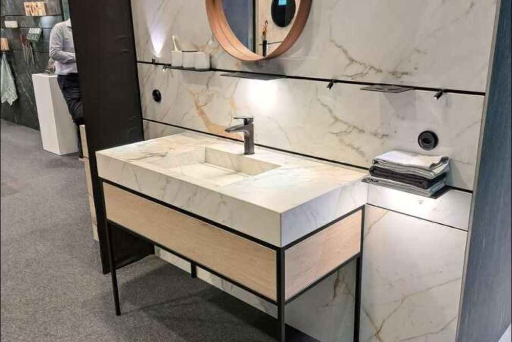 Kaum sichtbar, aber von grossem Nutzen ist auch das System «TheWall». Die Küchenbaufirma Orea AG aus Zürich widmete einen ganzen Stand diesem Wandsystem mit den Stromschienen, in die Vorbauelemente eingehängt werden können. Und da ja Platten bis zu einer Dicke von 21 Millimetern an dem Systemrahmen befestigt werden können und die Tragfähigkeit ansprechend hoch ist, gab es auch bei Steinform einige Exponate mit diesen stromführenden Schienen zu sehen.