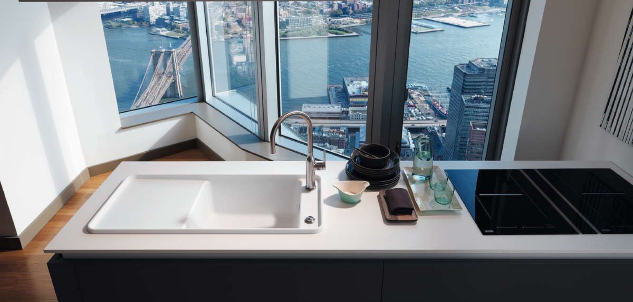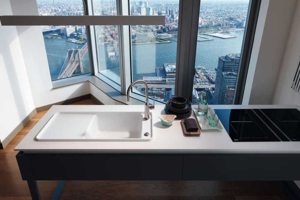 Das modulare Küchensystem «Frames by Franke» umfasst neu die avantgardistische Spüle «Style» im Retrodesign aus dem Material «Fragranit+». Ihre weichen Radien, die schlanken Proportionen sowie der neue lichtdurchlässige Farbton Alabaster verleihen ihr eine leichte, elegante Anmutung. Der exponierte Rand grenzt den Nass- vom Trockenbereich ab und bietet genügend Fläche für das frei platzierbare Schneidbrett aus geöltem Holz und einer dunkelgrauen Rüstschale mit vier praktischen Fächern. Die logische Anordnung der seitlichen Armaturenbank visualisiert den modernen Lifestyle in der Küche.