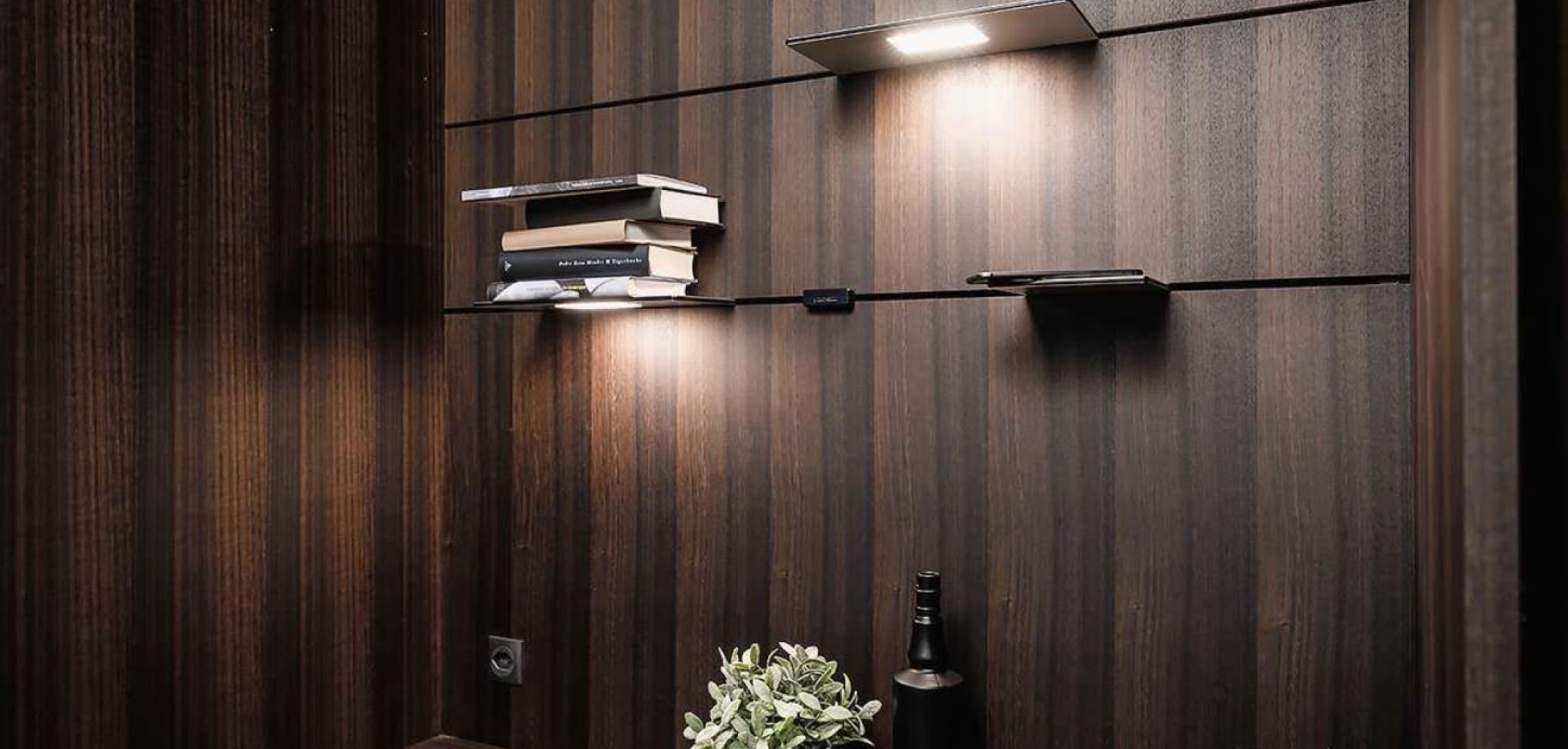 «The Wall» ist ein neuartiges modulares Rückwandsystem aus dem Angebot der Beat Bucher AG. Das System ist in 20 ver- schiedenen Oberflächen auf Mass erhält- lich oder in einer Ausführung zum selber Beplanken. Die leichte Sandwichkonstruktion kann mit einer oder zwei Trägerschienen ausgestattet werden. Diese vierphasigen Stromschienen können individuell mit Tablaren, mit und ohne LED-Spots, sowie einer grossen Auswahl an weiterem Zubehör, wie USB-Docks, Induktionsboard oder Gewürzboards, bestückt werden. Alle Elemente sind in den Schienen frei positionierbar und die Wand kann rasch und unkompliziert montiert werden. Das filigrane Tragsystem unterstützt eine minimalistische und moderne Formensprache und setzt Objekte in Szene.