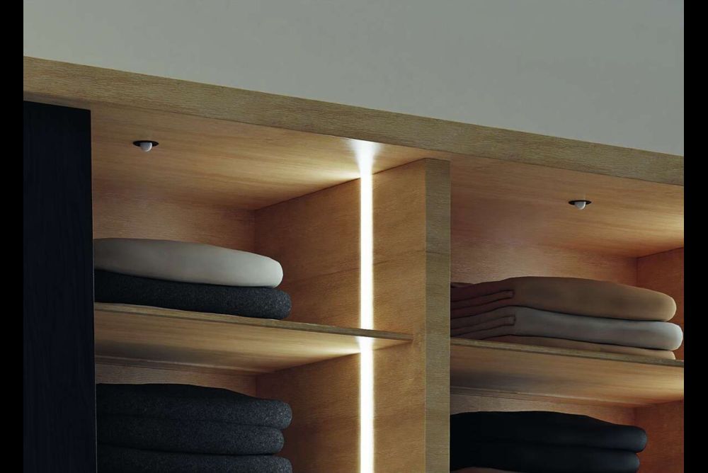 Bei der Steuerung des Lichtes stehen vor allem Korpusmöbel, Kleiderschränke und die begehbaren Varianten im Fokus. Auch ohne Fronten können Impulsnehmer mit der Funktionsweise eines Bewegungsmelders die Schaltung des Lichtes für begehbare Kleiderschränke übernehmen. Bei vorhandenen Türen reagiert der Sensor beim Öffnen der Front. Inzwischen sind die Bauteile recht klein geworden. Eine Zehn-Millimeter-Bohrung genügt und manche Varianten können auch rückseitig eingebohrt und verdeckt montiert werden. Solche Anwendungen von Sensoren sind häufig, denn oft weisen die Korpusse Schiebetüren auf. Aber auch hier bleibt das Bauteil ein seperates Element. «Einen Sensor in die Schiebetürbeschläge zu integrieren, ist möglich, wird aber von den Beschlagherstellern bislang kaum aufgegriffen», sagt Kroll.