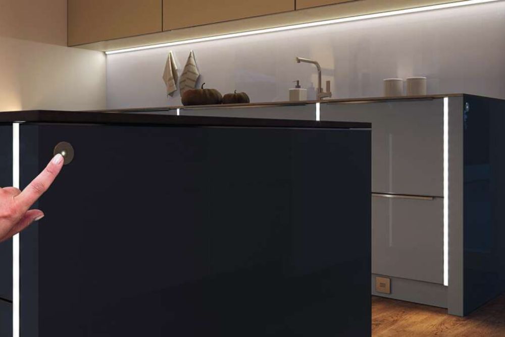 Im Möbel- und Innenausbau tauchen Sensoren meist für die Steuerung von Leuchten auf. Oft bereits integriert für die Korpusinnenbeleuchtung beim Öffnen von Küchenauszügen oder Türen, werden die Impulsaufnehmer zur motorischen Unterstützung von Bewegungsvorgängen dagegen bislang kaum eingesetzt. «Beschläge mit elektromechanischer Unterstützung, die durch Antippen funktionieren, sind zwar mittlerweile schon verbreitet. Komplett berührungslose Steuerungen dagegen sind im Bereich der Beschläge eher schwierig», sagt Walter Anderegg, Produktemanager Möbelbeschlagstechnik bei der Opo Oeschger AG in Kloten ZH.