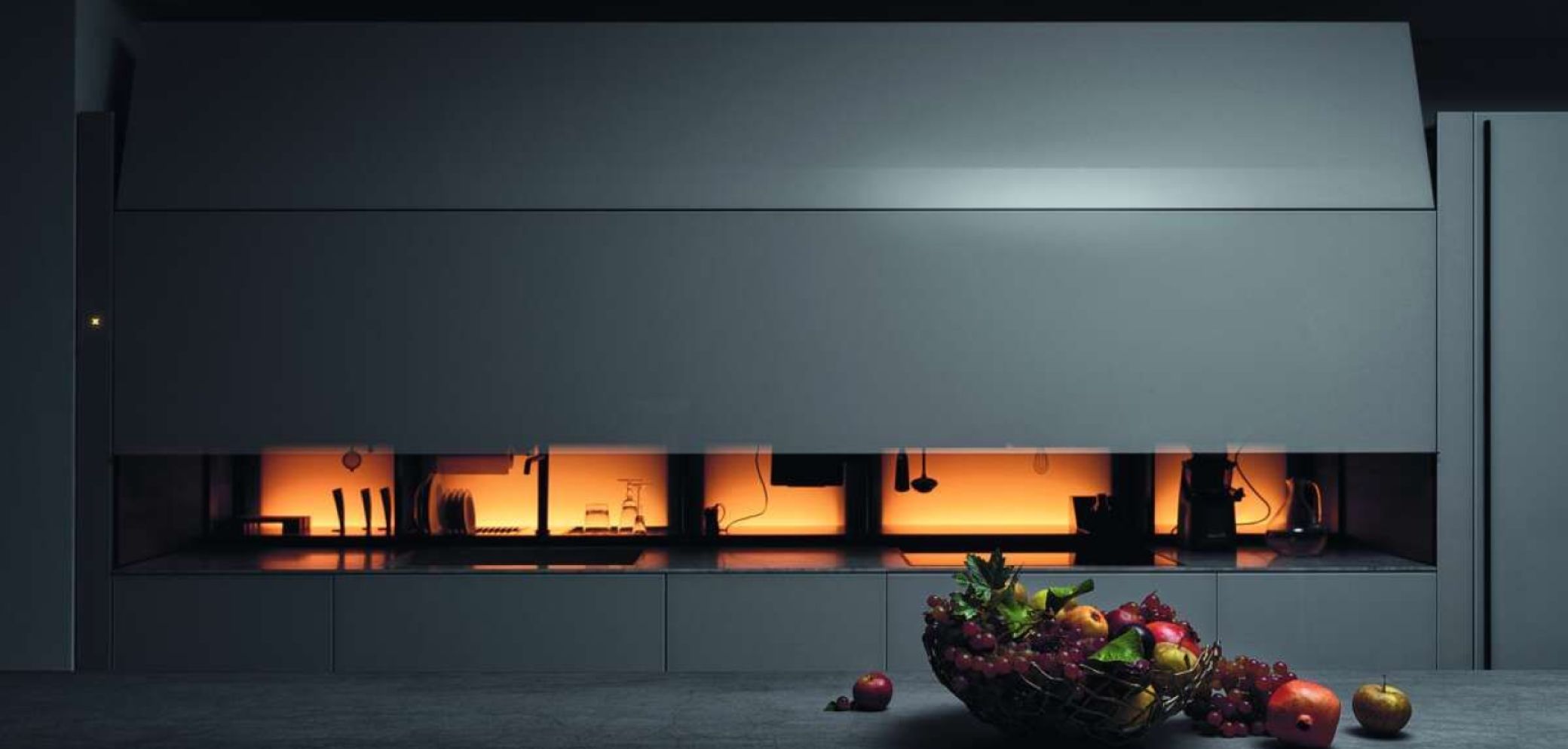 Es genügt ein einfacher Fingerzeig. Dann setzt sich recht unvermittelt die Front der Küche in Bewegung. Die Fläche, über die Breite von mehr als drei Metern, fährt nach oben und das Flächenlicht der Rückwand erscheint langsam. Erst rot, dann gelb und schliesslich weiss. Während so vor dem ersten Kaffee die Sonne aufzugehen scheint, schwenkt der Wasserhahn aus und die Küchenzeile des italienischen Herstellers Valcucine ist sodann betriebsbereit. Das Ganze ist ein Akt von Sekunden. Gebannt schaut das Publikum am Stand an der Messe Eurocucina in Mailand diesem Prozedere zu. Ausser den erstaunten Kommentaren derjenigen, die dem Schauspiel beiwohnen, ist dabei eigentlich kaum etwas zu hören. Ein Hauch von Magie liegt in diesem Moment in der Luft; Untätigkeit und trotz- dem Aktion. Damit die Motoren des Schiebebeschlages für die Front, die Armatur sowie die Leuchtensteuerung zeitgleich in programmierter Abfolge auf den Fingerzeig reagieren, braucht es einen Signalgeber und gleichsam wichtig: die Technik dahinter.