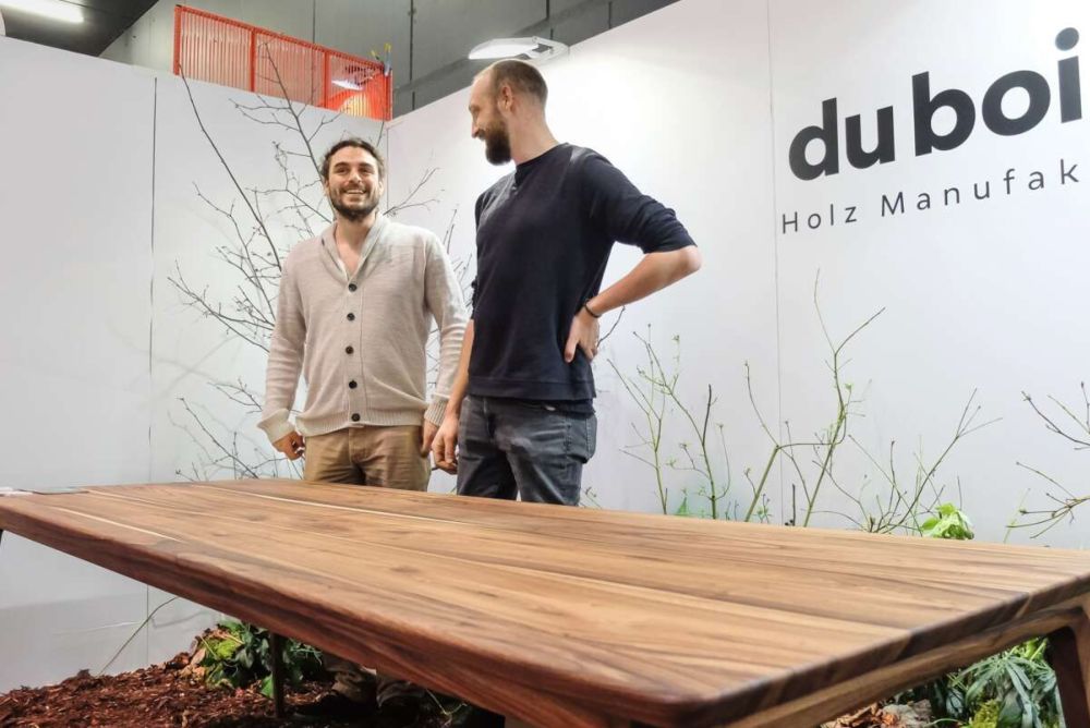 «Ein Tisch ist ein Tisch», heisst eine bekannte Kurzgeschichte des Solothurner Schriftstellers Peter Bichsel. Was ein rechter Tisch ist, sahen die rund 12 300 Besucherinnen und Besucher an der «Blickfang» am vergangenen Wochenende in Basel gleich mehrfach. Etwa das Modell «Le Héron» von der noch jungen Manufaktur «du bois» aus Bottmingen BL. Der von Marvin Nix und Sebastian Freudenreich vorgestellte Massivholztisch aus regionalem Nussbaum wurde just zur «Blickfang»-Premiere fertig. Seinen Namen (deutsch: Reiher) hat er von den schlanken Beinen, die mit einer Schlitzzapfenverbindung am Gestell angebracht sind. «Ein zweiter, schon fast fertiger aus einem anderen Holz steht in der Werkstatt», sagt Nix. Die beiden jungen Schreiner und Designer lassen durchblicken, dass sie ausserdem an einem Entwurf für passenende Stühle arbeiten. Zunächst gilt es aber, die Resonanz der Designmesse abzuwarten.