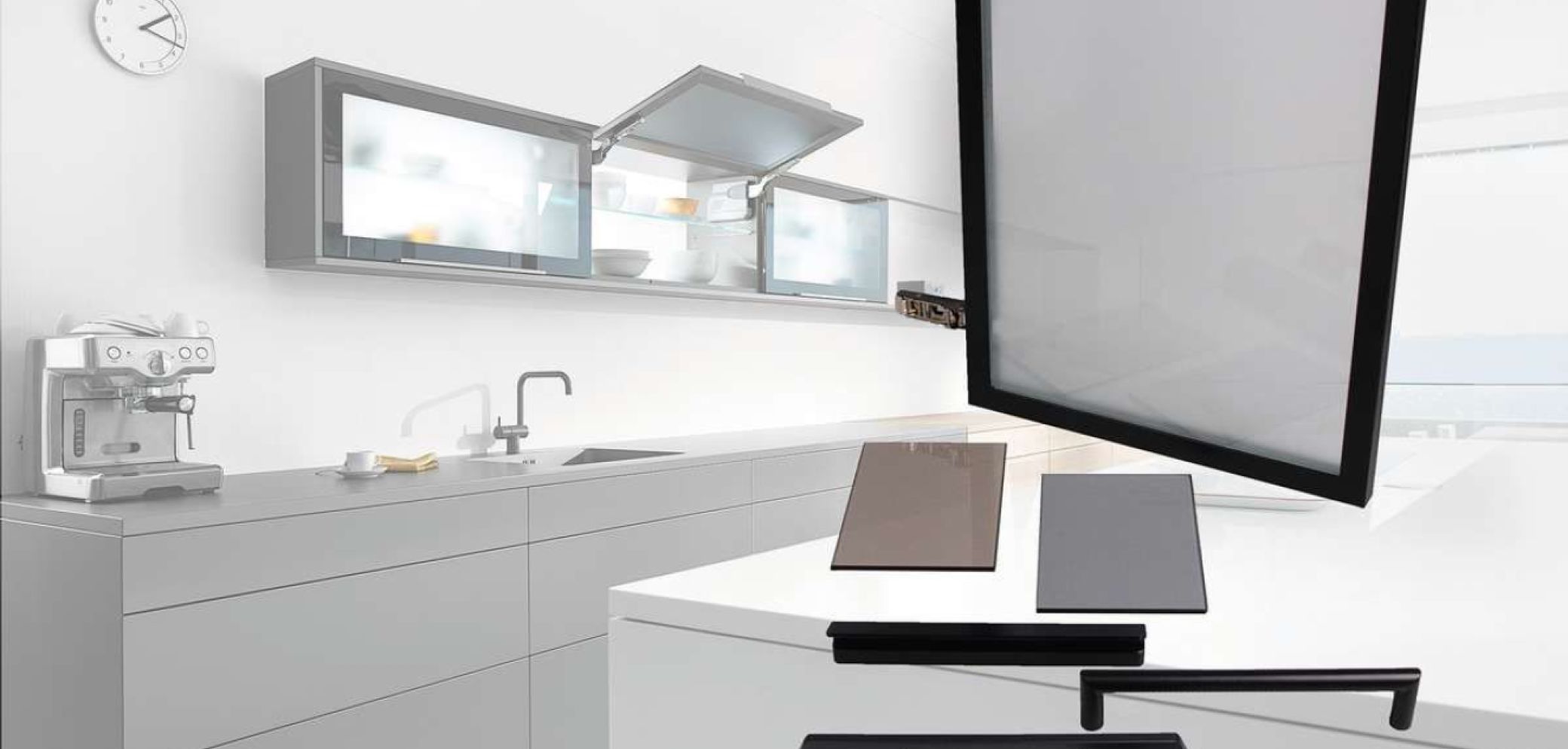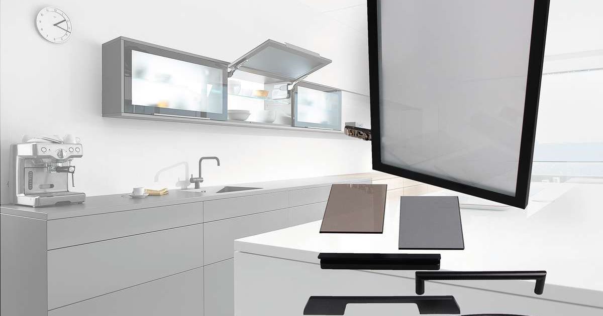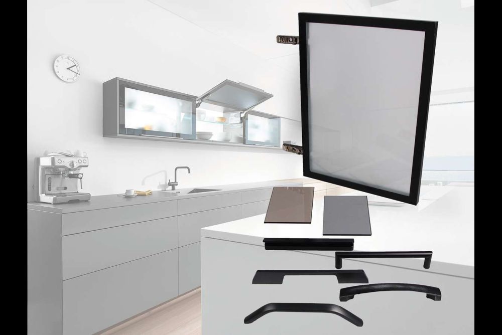 Passend zu den aktuellen Trends, wurden schwarze Möbelgriffe ins Bucher-Lagersortiment aufgenommen. Dieses umfasst neben den klassischen Griffen auch Griffleisten und Griffmulden. Auf Wunsch können solche auf Mass konfektioniert und ebenfalls in einer schwarzen Oberfläche bestellt werden. Passend dazu gibt es schwarze Aluminium-Rahmentüren, neu mit entsprechenden Gläsern in dunklen Tönen. Diese können online inklusive Blum-Aventos-Klappenbeschläge kon- fektioniert werden. Gerade bei hellen Oberflächen verleihen diese schwarzen Beschläge attraktive optische Akzente.