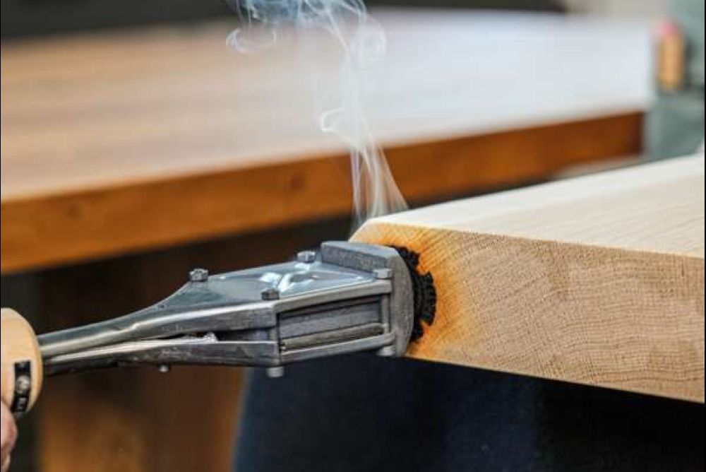 Lunt und Hahne sind sich bewusst, dass es viele gute Schreinereien gibt, sie stellen sich aber auch die Frage, weshalb diese ihre Produkte nicht beschriften. «Wenn wir etwas machen, soll es auch hochwertig sein. Wir wollen zu 100 Prozent dahinter stehen können, weshalb wir unsere Tische auch mit Stolz beschriften», sagt Hahne. Die Beschriftung machen sie mit einem Brandstempel, der je nach Kundenwunsch respektive Blattdicke als Schriftzug oder als grafisches Element auf der Stirnseite des Tischblattes eingebrannt wird. Stirnholz eignet sich am besten dafür, weil es schärfer verbrennt und die Konturen nach dem Schleifen besser zu sehen sind. «Es gibt auch Kunden, die wollen keinen Stempel, was auch vollkommen okay ist. Wir sagen dann halt einfach mit einem Augenzwinkern, wenn er nicht drauf ist, ist er in fünf oder zehn Jahren nur noch halb so viel wert», sagt Hahne schmunzelnd. «Die Beschriftung ist einerseits ein Qualitätssignet, andererseits auch Marketing. Am Tisch kommt man zusammen, schaut automatisch auf das Logo, und schon ist man im Gespräch», sagt Lunt.