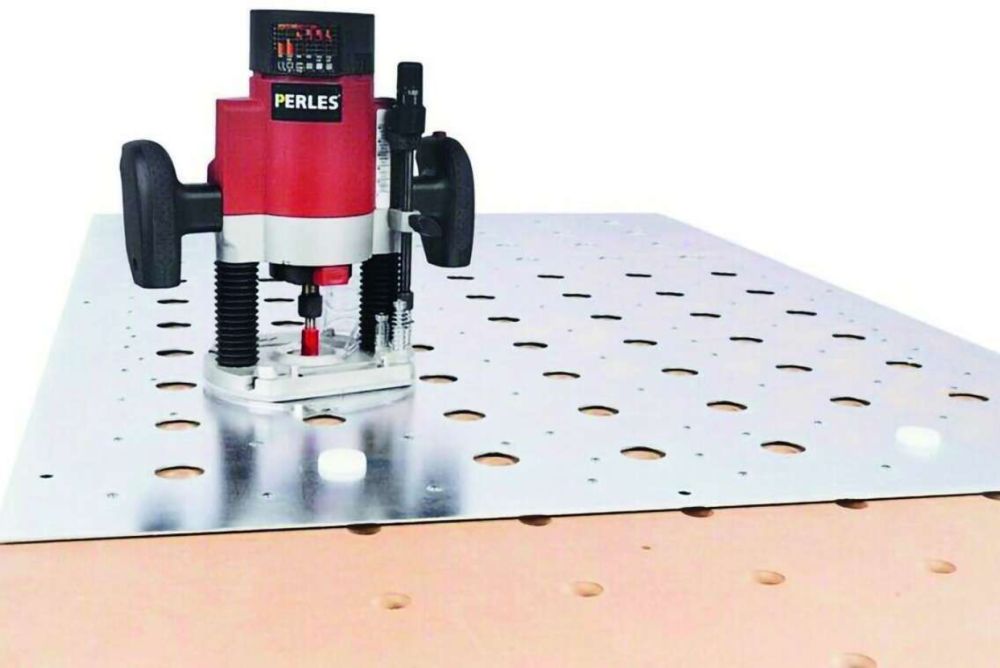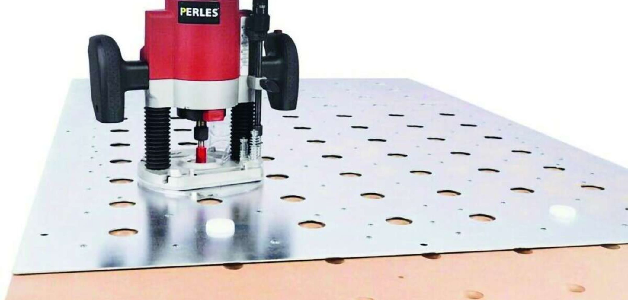 Für Besitzer einer hochwertigen Lochrasterplatte auf ihrem Multifunktionstisch (MFT) kann jede Schnittverletzung der Platte gravierend sein. Dabei sind solche bei der regelmässigen Nutzung eines MFTs unvermeidlich. Sauter bietet mit dem Vario-Master-MFT eine verzinkte Stahlschablone an, mit welcher schnell und einfach eine Kopie der abgenutzten Lochrasterplatte hergestellt werden kann – und das mit einer hohen Genauigkeit. Ist der Multifunktionstisch fertig, kommt das vielseitige Zubehör mit Aufnahme von 20 mm Durchmesser ins Spiel. Besonders erwähnenswert sind die Bankhaken des Vario-Master-MFTs, die mittels M6-Gewinde spielfrei durch den neuen Tisch in die darunterliegende Vario-Master-MFT-Stahl- platte geschraubt werden.