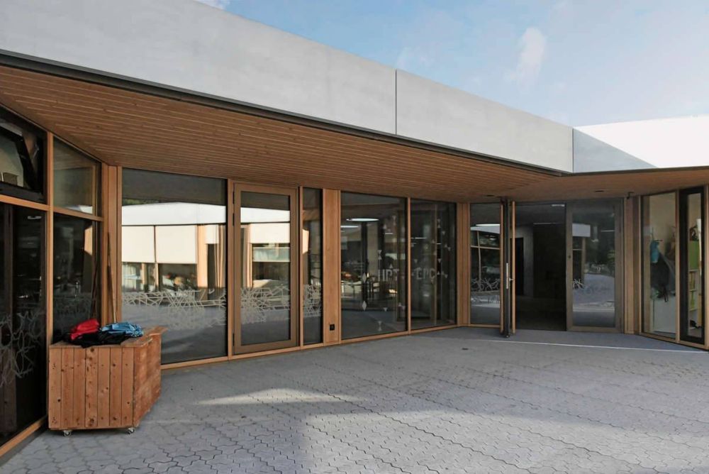Geometrische Bilder, die fast unmerklich variieren – jedes Klassenzimmer hat ein eigenes Muster – und trotz der Vielfalt einheitlich wirken. Das Kunstbudget, das für den öffentlichen Bau bereitgestellt worden war, wollten die Bauzeit-Architekten nicht bis zum Schluss aufsparen, um es dann in eine Skulptur oder ein Bild zu investieren. Die Kunst sollte in das Gebäude integriert werden und einen architektonischen Mehrwert bringen. Mit der durchgängigen Gestaltung der Gläser sei das gelungen.