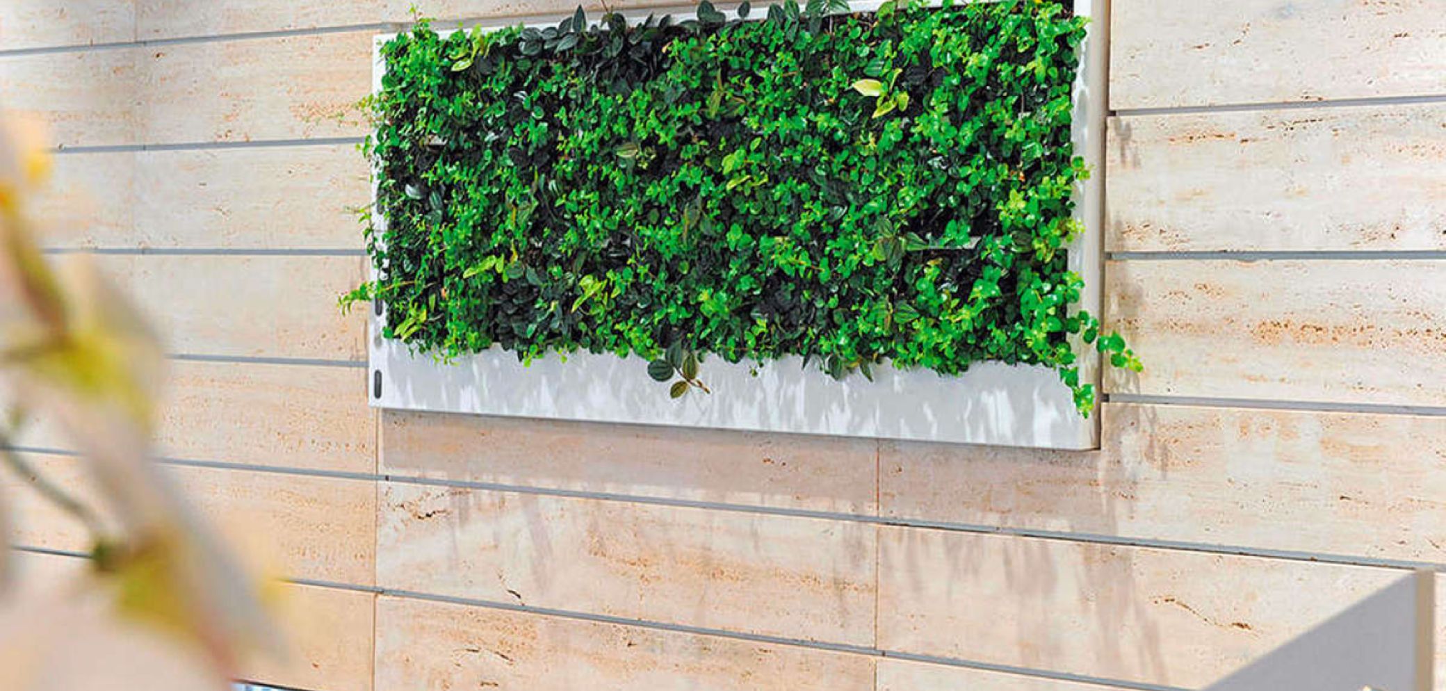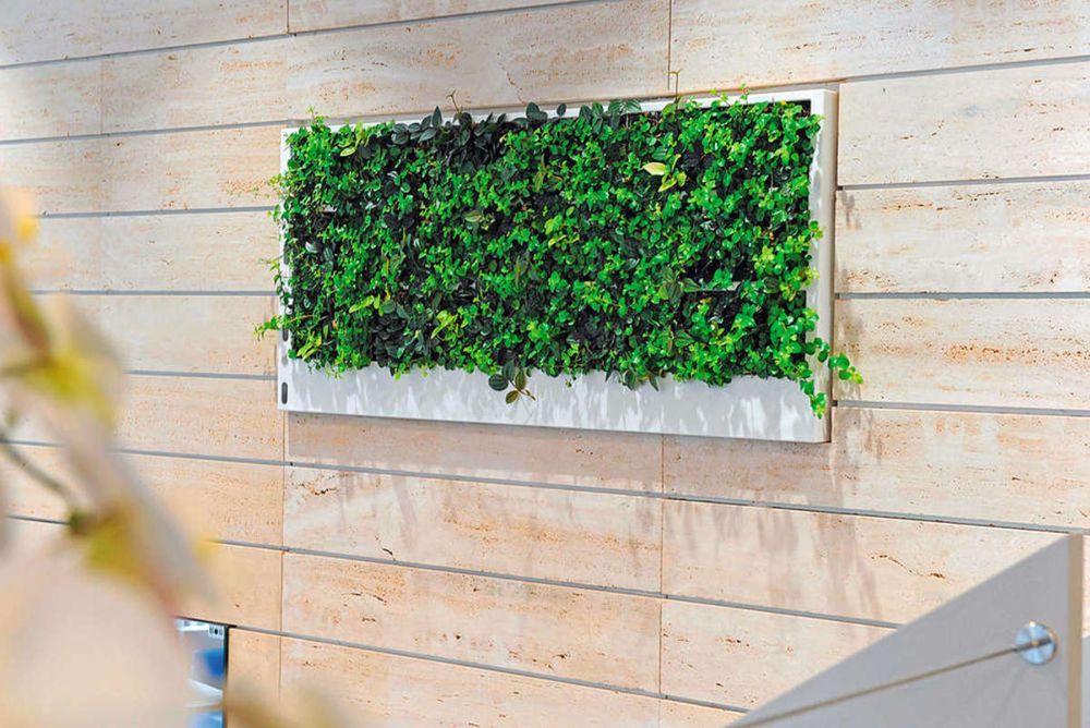 «Verticalis» von der Hydroplant AG kann wie ein Gemälde, das mit kleinwüchsigen Pflanzen und Moosen bepflanzt ist, ganz einfach an jede Wand montiert werden. Pflanzen wirken positiv auf Menschen. Während der Photosynthese wandeln sie mit Sonnenlicht Kohlendioxid in Zucker und Sauerstoff um, sie binden Feinstaub und können sogar die Luft reinigen. Zudem sorgen Pflanzen für eine natürlich befeuchtete Atemluft und wirken schallabsorbierend. Die Grösse einer Einheit in L × T × H beträgt 129 × 7,5 × 59 cm. Erhältlich ist der Rahmen aus Kunststoff in den Farben Schwarz und Weiss. Auf Wunsch sind auch individuelle Farben möglich.