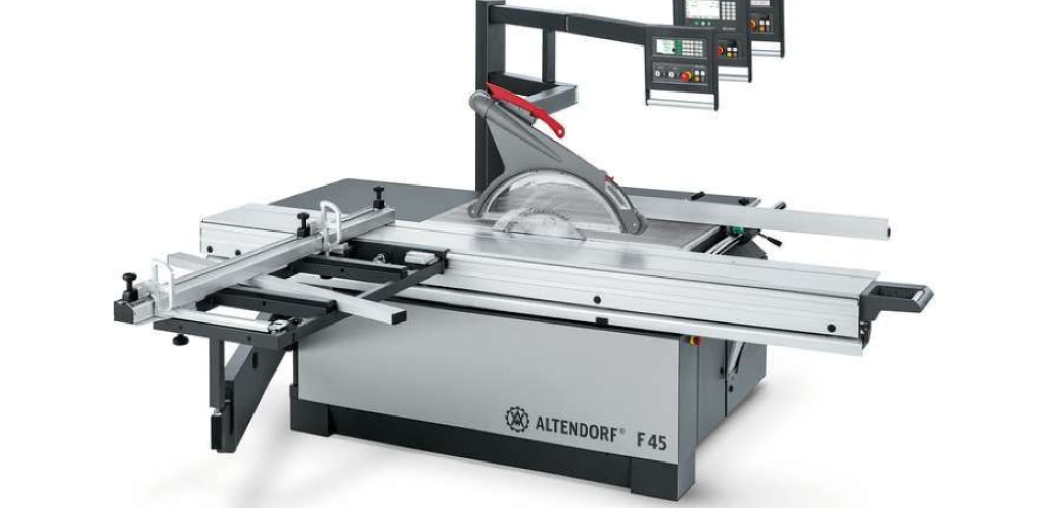 Die neue Altendorf-Generation besteht nur noch aus dem Modell F 45. Doch dafür gibt es drei neu konzipierte Steuerungen. Mit allen können bis zu vier Achsen vom zentralen Panel in Augenhöhe bedient werden. Mit «ProDrive» lassen sich auf dem Bildschirm mit 90 mm Diagonale alle Werte und Funktionen deutlich ablesen. Über die grünen Tasten ruft man die Funktionen Höhe und Schwenkung des Sägeblatts auf, das beidseitig +/− 46° reicht. Je nach Ausstattung werden zudem die Optionen CNC-Parallel- und Winkelanschlag, Vorritzer, stufenlose Drehzahlregelung von 2000 bis 6000 U/min und die Zusatzfunktion Nuten aufgerufen.