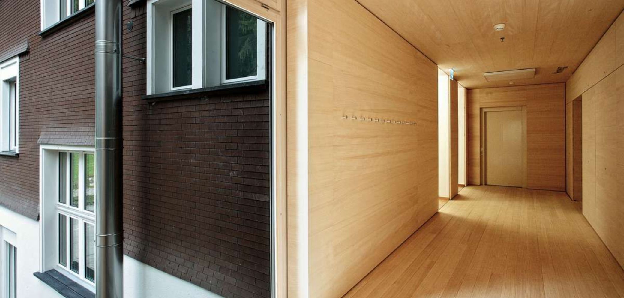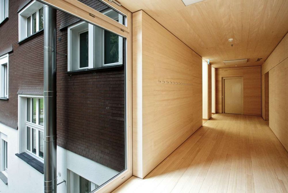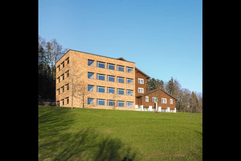 Als Kontrast zum bestehenden Gebäude wurde eine Kubusform gewählt. Bei der Planung zeigte sich die exponierte, mit Sonne verwöhnte Höhenlage (883 m ü. M.) als Pluspunkt: Sie ermöglichte für die Wände die Vollholzkonstruktion «System Gisler». Dabei funktioniert die einstoffliche Wandkonstruktion als Klimaanlage: Die Masse der Holzelemente schützt tagsüber vor Hitze, indem sie diese aufnimmt. In der Nacht kühlen die Holzwände wieder aus. In der kalten Jahreszeit sorgt eine Schnitzelheizung für Wärme.