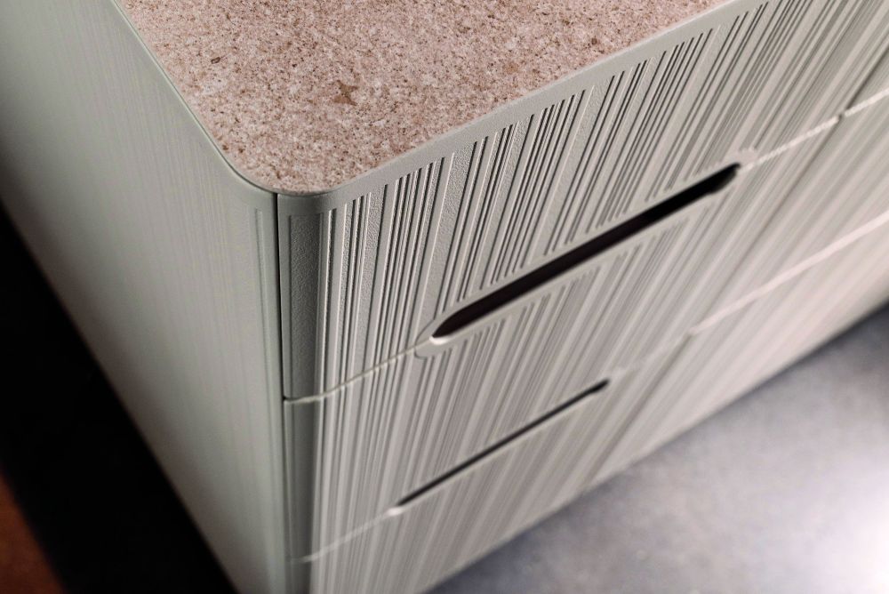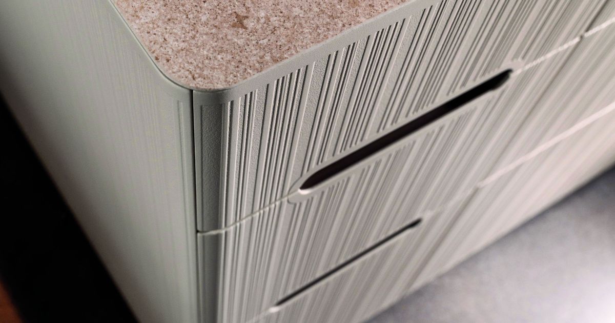 Die Woodcoat-Kombination aus CNC-Bearbeitung in Schreinerqualität, Lasertechnik und Pulverbeschichtung ermöglicht einzigartige Designs: Griffmuscheln und -leisten, 3D-Reliefs, Randabstände, Rundecken oder Muster werden in MDF gearbeitet und fugenlos pulverbeschichtet – ohne Vergilbungsrisiken wie bei ABS-Kanten. Laseroberflächen skalieren exakt auf Frontgrössen, etwa mit umlaufenden Rändern oder zeitlosen Mustern, und verleihen den individuellen Möbelfronten eine unverwechselbare, haptische Signatur. Dank der Unikante heben sich Gestalterinnen und Gestalter ab und nehmen sich aus dem Preiskampf.
