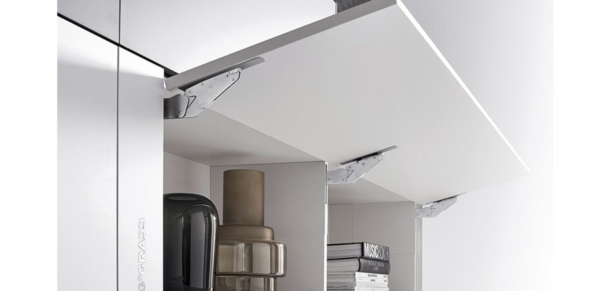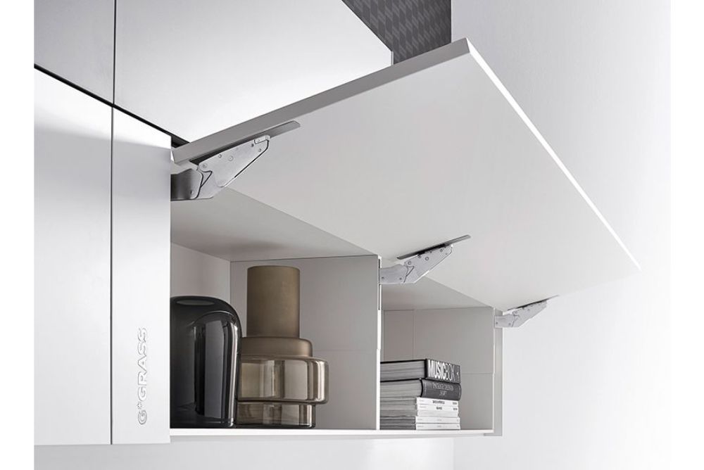 Kinvaro T-Slim fügt sich nahezu unsichtbar in das Möbelstück ein, eröffnet so vollkommen neue Möglichkeiten für den Oberschrank und bedient damit einen aktuellen Trend. Besonders querformatige Stauräume mit Drehklappen erleben derzeit eine Renaissance.