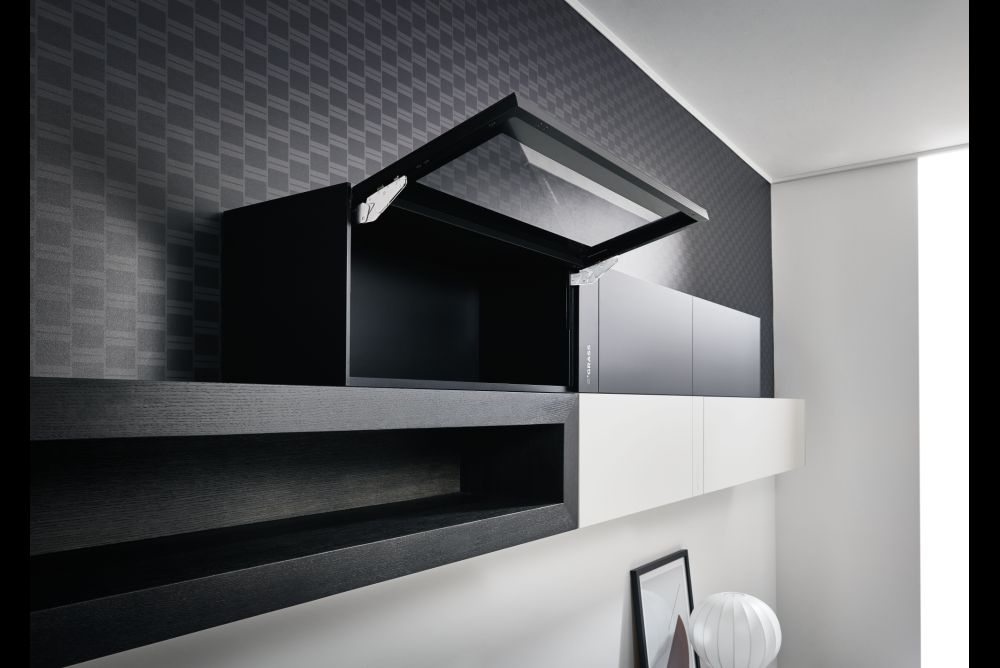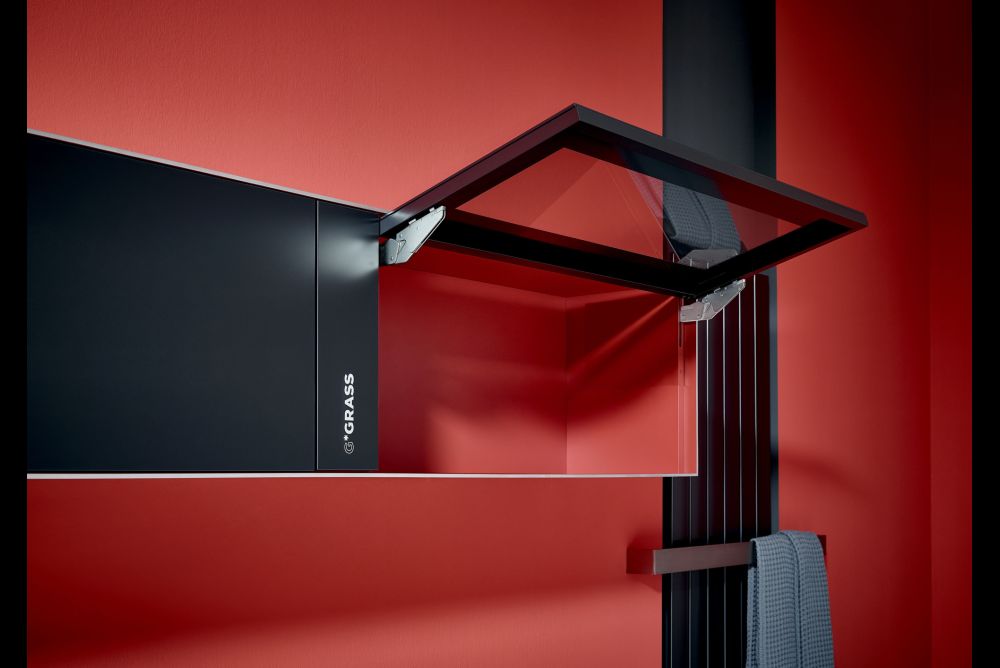 Die Herausforderung dabei ist klar: Bei einem Möbel, das auf Augenhöhe montiert ist, fällt jedes technische Detail ins Auge. Hier setzt Kinvaro T-Slim an: Den Ingenieuren von Grass ist es gelungen, die komplexe Mechanik des Dreh-Beschlags auf eine Baugrösse von 12 Millimetern zu reduzieren. Mit dieser Reduktion sind Möbeldesigner maximal flexibel. Ab 16 Millimeter Seitenwandstärke ist alles möglich. Auch Hinsichtlich des Materials gibt es kaum Beschränkungen.