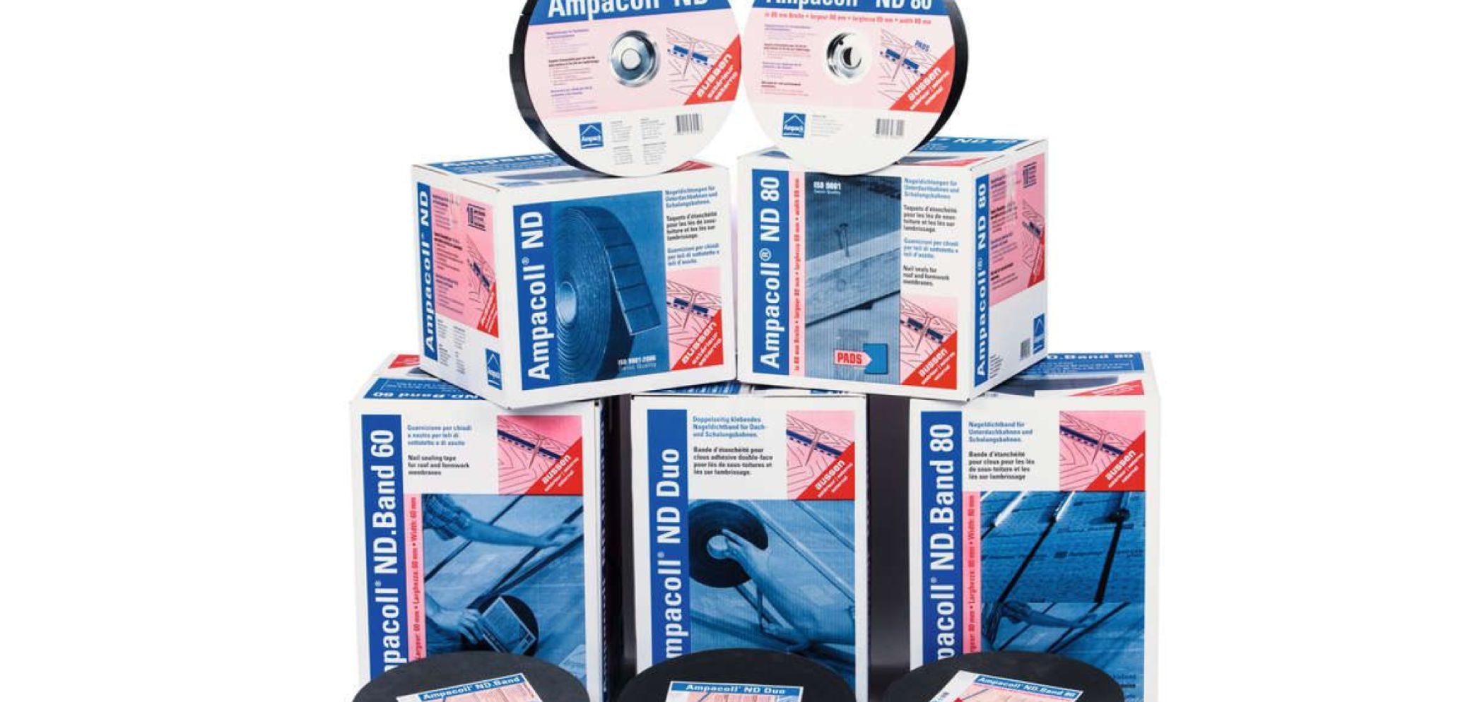 Die Firma bietet die «Ampacoll ND»-Nageldichtprodukte in 60 und 80 mm Breite an, jeweils sowohl als Pads als auch als Band. Ergänzt wird das Sortiment durch das 60 mm breite, beidseitig klebende Nageldichtband «Ampacoll ND Duo».