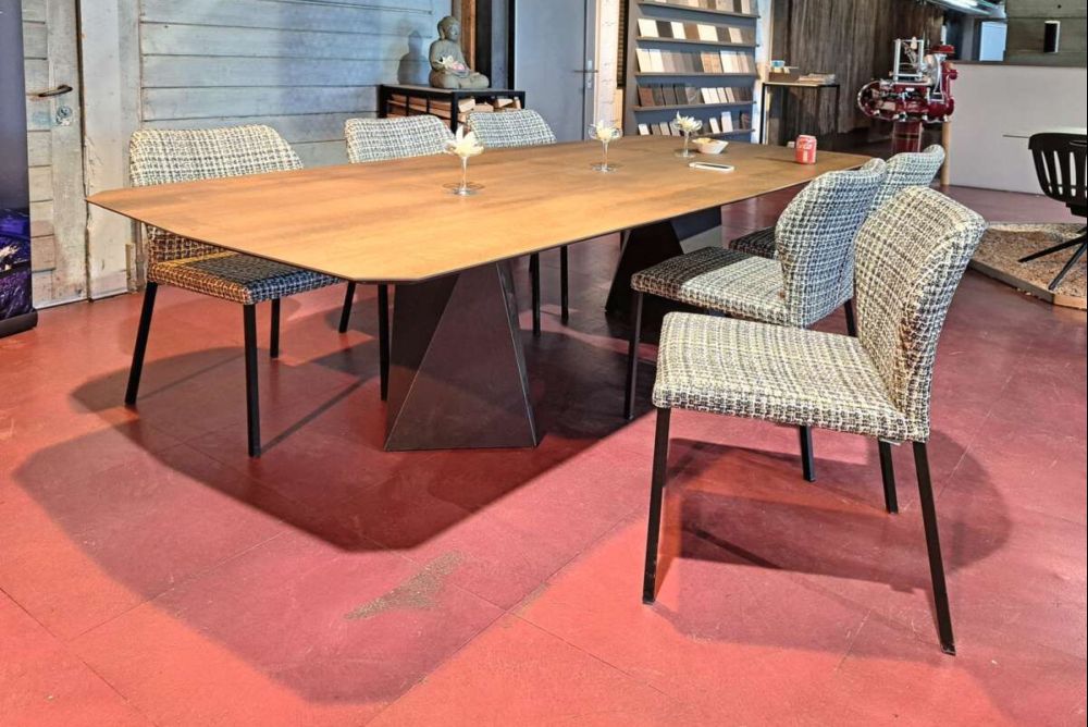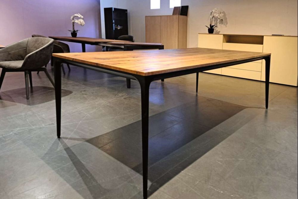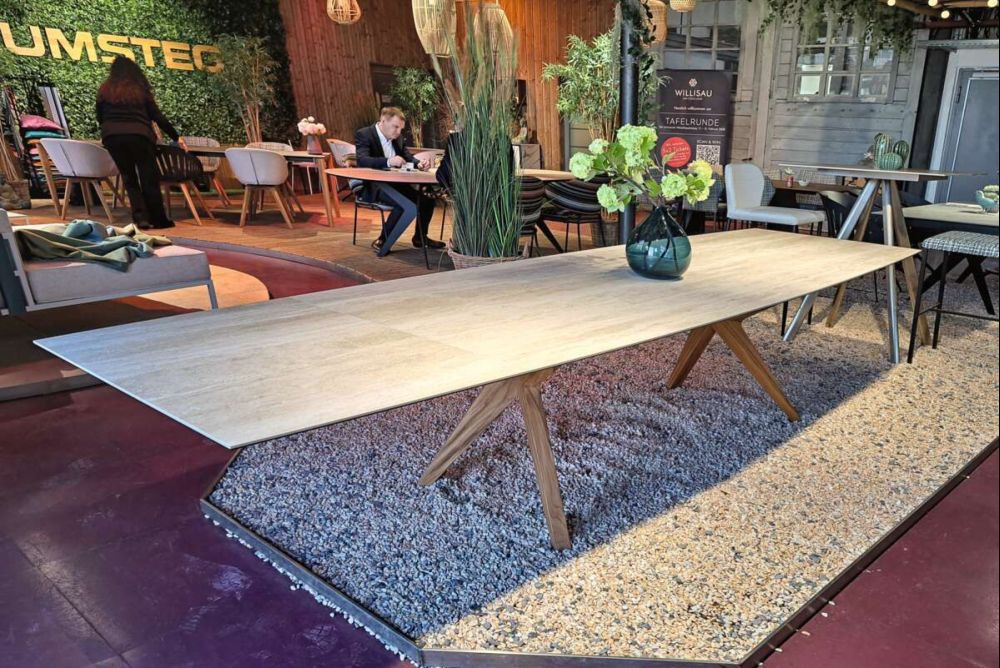 Die Möbel von Zumsteg sind vor allem für den Aussenbereich gedacht. Neu gibt es einige der Tisch- und Stuhlmodelle mit Untergestellen aus Teak. Daneben zeigte der Hersteller mit dem Tisch «Trikon» ein Modell, das aussen vollständig aus Keramikplatten besteht. Bemerkenswert war auch der ausgestellte, bootsförmige Tisch «Lana», der über beidseitig ausziehbare, lange Tischverlängerungen verfügt. Beim Ausziehen verbleibt das Untergestell an Ort.
