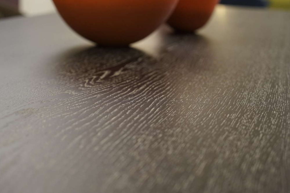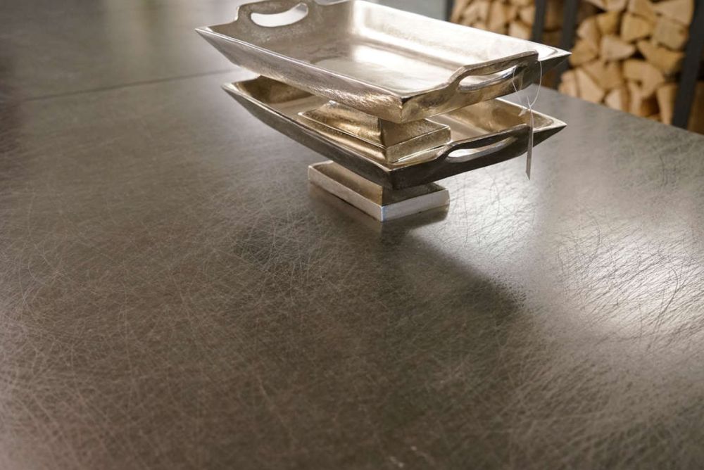 Bei Girsberger kann der Endkunde weitgehend die Grösse seines Tisches bestimmen. So gibt es den Tisch «Barra» neu auch rund mit Durchmesser von 1000 bis 1600 mm – und das in 50-mm-Schritten. Der Büro- und Sitzungsstuhl «Simplex 3D» wird in Zukunft auch für den Wohnbereich angeboten. Der Hersteller bietet zudem gebürstete und danach gekalkte Eichenoberflächen an. Am Stand der Marke «Luiz» war eine Keramikplatte zu sehen, der starke Kratzspuren zugefügt worden waren. Das hat optisch wie haptisch eine interessante Wirkung.