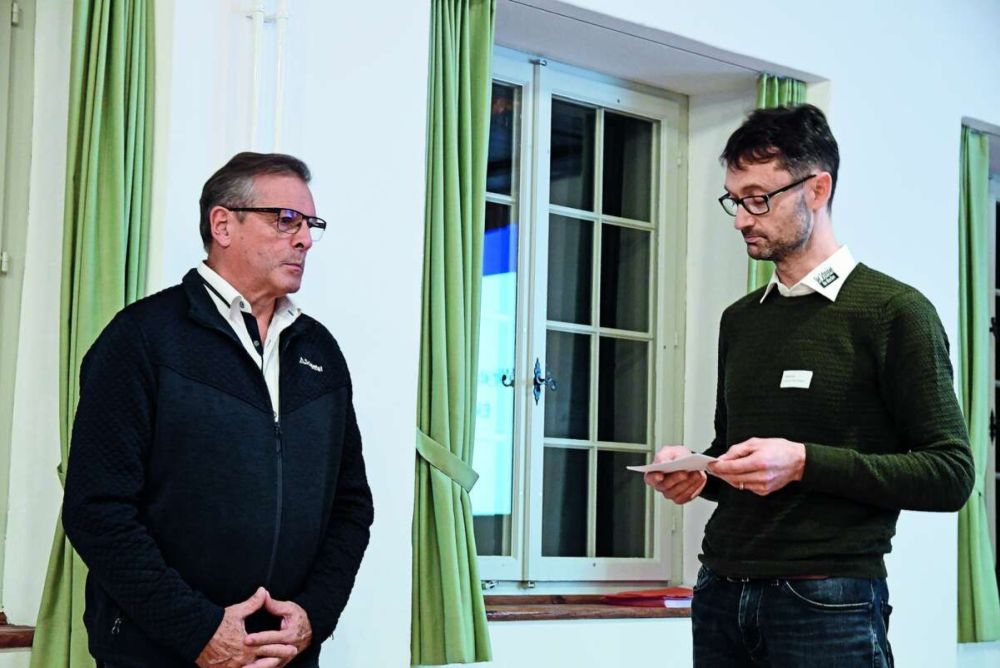 Chefexperte Pascal Graf (r.) verabschiedet Heinz Schadegg nach 16 Jahren Engagementals Prüfungsexperte. Bild: Werner Lenzin