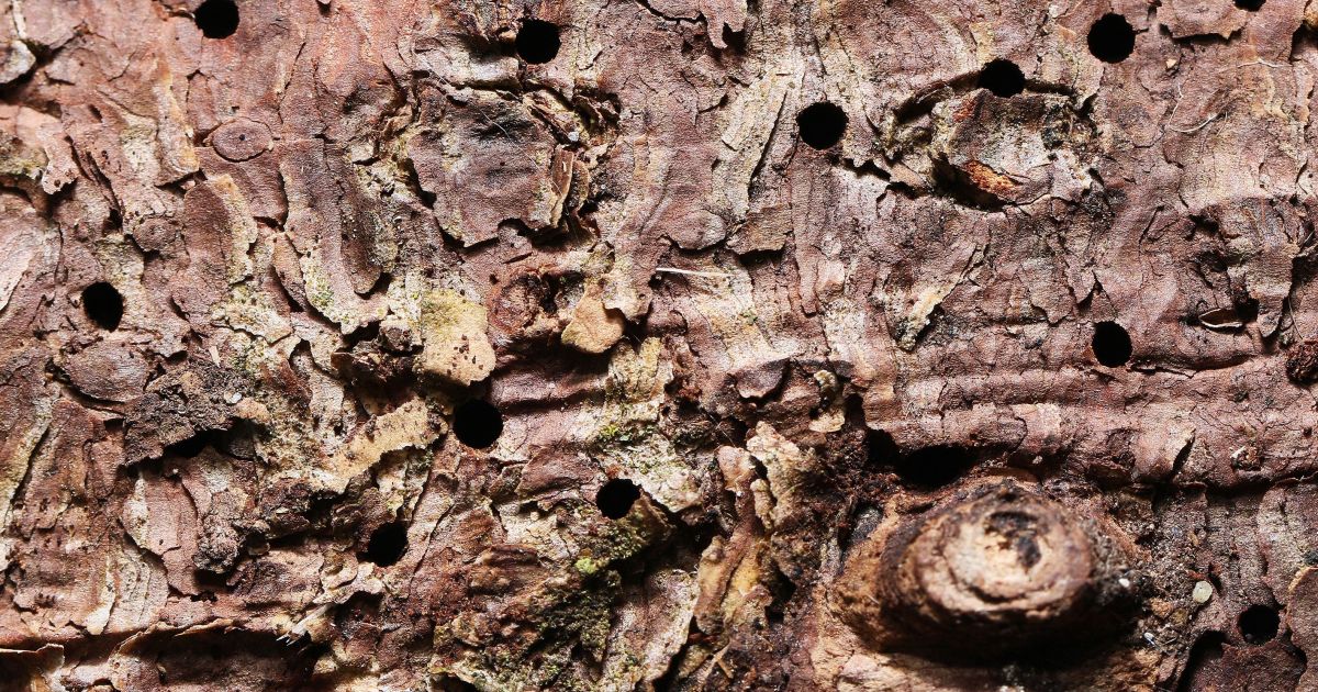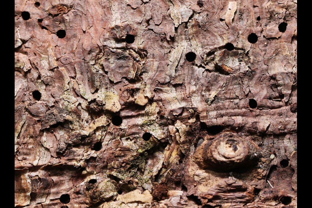 Fichtenborke mit Einbohrlöchern des Nordischen Fichtenborkenkäfers. Bild: Beat Wermelinger