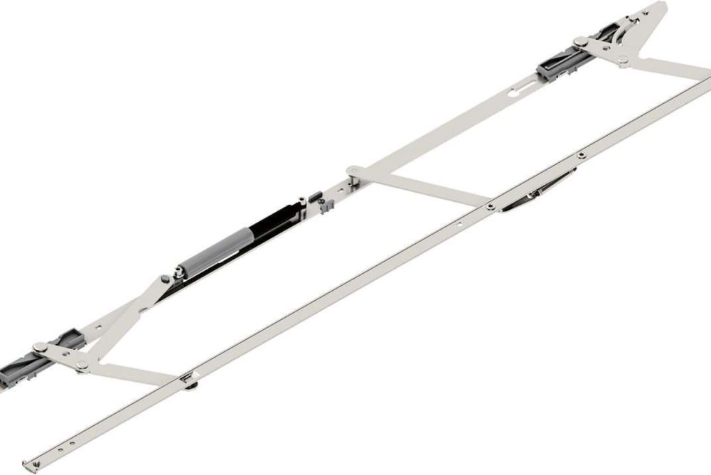 Für hohen Bedienkomfort sorgt die vierte Neuheit: eine zusätzliche, auch zur Nachrüstung geeignete Kippunterstützung für das Parallelschiebesystem PS Air Com mit griffgesteuerter Kipplüftung. Das Bauteil in Form einer federunterstützten Schere reduziert das Drehmoment am Griff, das beim Kippen entsteht. Selbst 180 Kilogramm schwere Flügel sind so mit geringem Kraftaufwand zu öffnen.