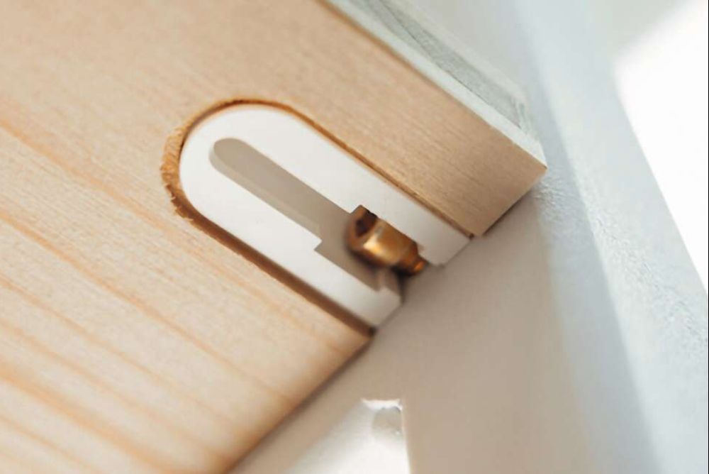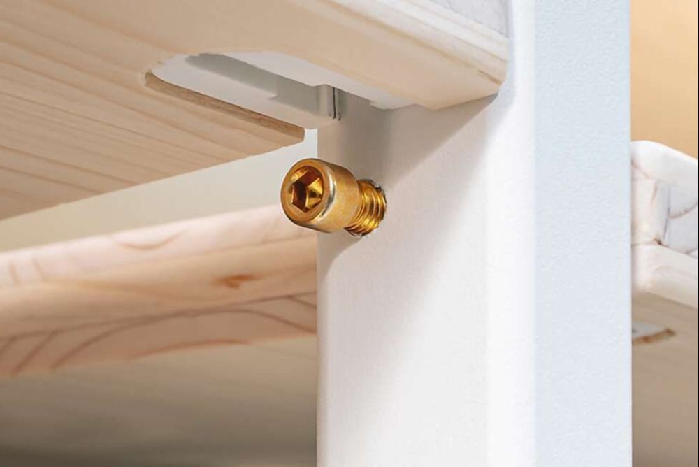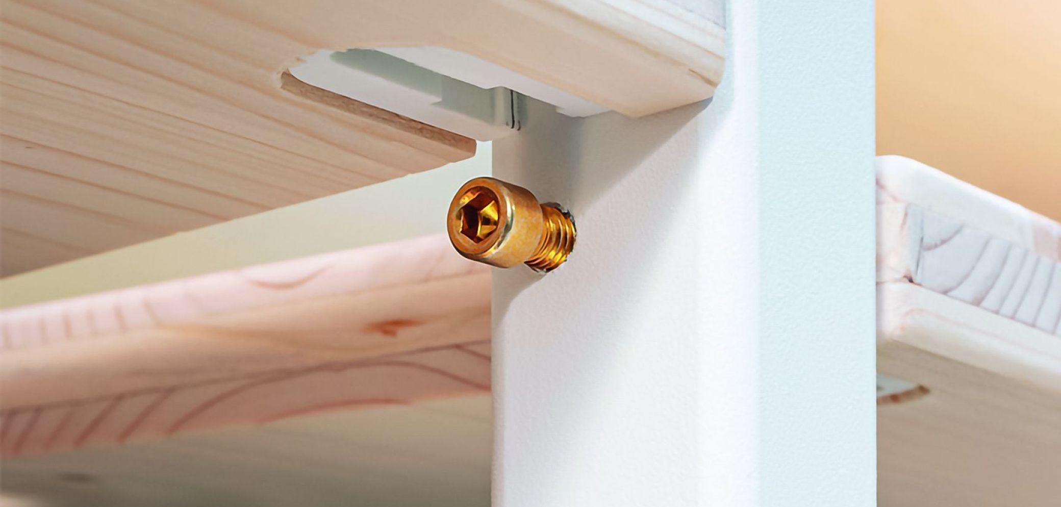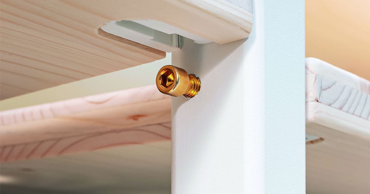 In Kombination mit den dazu passenden Schrauben schützt der neue Cabineo-Verbinder Fachböden vor dem Herausfallen. Bild: Lamello AG