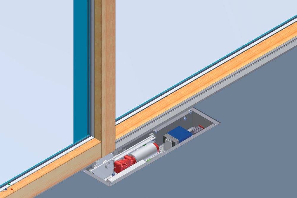 Mit dem «Drive» verfügt Roto in Zusammenarbeit mit der Firma Gilgen und der Ernst Schweizer AG jetzt auch über eine elektrisch angetriebene Variante. Der Motor dazu befindet sich aber nicht wie bei den Mitbewerbern am oberen Flügelfries innen, sondern raumseitig im Schwellenbereich und lässt sich vollständig verdeckt montieren. Am fertigen Objekt ist davon nur noch ein Servicedeckel zu sehen. Montiert man den Motorenkasten etwas tiefer, lässt sich der Deckel zusätzlich mit dem Bodenmaterial überdecken. Aus dem Gehäuse ragt ein Antriebszahnrad bis hinauf zum beweglichen Flügel. Dieses setzt den Flügel über eine Zahnstange in Bewegung. Die Übertragung der Bewegungsenergie findet dabei aber vollständig verborgen unter dem Flügel statt.