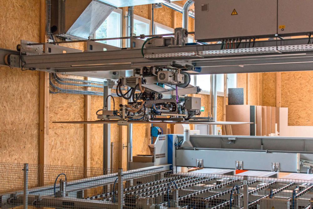 Im Inneren der Holzhalle konnte dank neuer Maschinen eine hocheffiziente Produktion eingerichtet werden. Kernstück ist eine vollautomatische Zuschnittfräse.