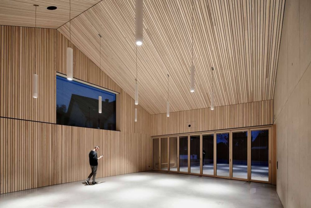 Die hölzerne Innenverkleidung wurde mit verschieden breiten Lamellen in unbehandelter Weisstanne ausgeführt. «Die unregelmässige Breite haben wir gewählt, weil es sonst im Auge zu flimmern beginnt», sagt Alexander Lang, Geschäftsführer der ortsansässigen Schreinerei Mobil Werke AG. Die Unterkonstruktion der Verkleidung besteht aus Vlies und Dämmung und sorgt für eine angenehme Akustik. Lüftung und Elektroinstallationen verbergen sich komplett hinter der Konstruktion. Auf diese Weise wird die stringente Linienführung durch nichts gestört.