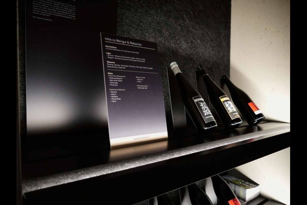 Für diese wie auch andere Feinheiten war es hilfreich, dass alle Handwerker aus der Gegend waren. Immer wieder traf man sich vor Ort, um Gestaltung und technische Umsetzung weiterzuentwickeln. In Teamarbeit entstanden auch die drei Degustationsmöbel in der Raummitte.