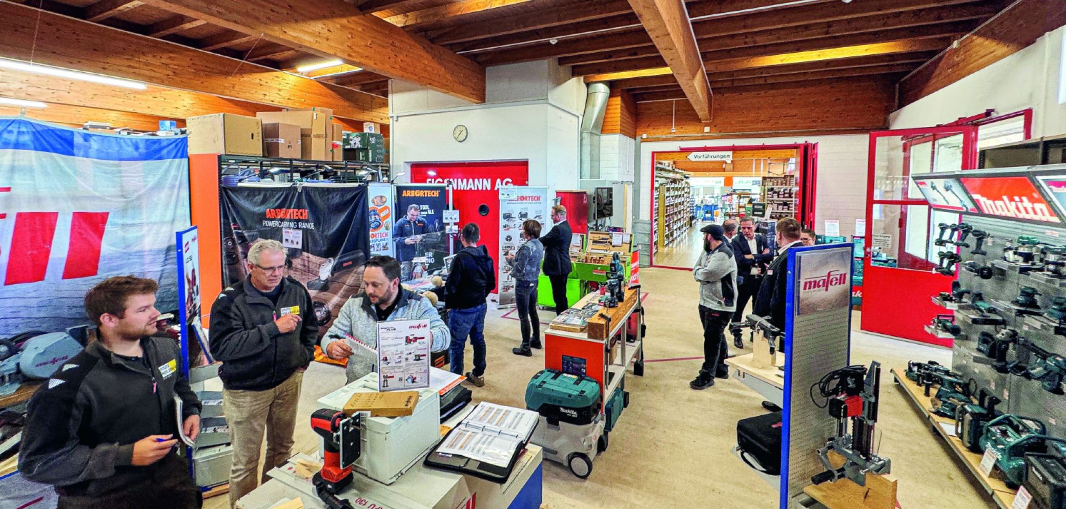 Im Rahmen der Veranstaltung konnten die Gäste auch die Werkstatt besichtigen und sich ein Bild von den Serviceleistungen machen. Elektrowerkzeughersteller Makita war mit einem Bus vor Ort, wo sich ebenfalls verschiedene Maschinen testen liessen, zudem bietet das Ladenlokal auf rund 600 Quadratmetern eine üppige Auswahl an Elektrowerkzeugen und Geräten. Nebst neuen Maschinen wurde auch ein Occasionscenter vorgestellt, in dem sich konstant über 200 revidierte Gebrauchtmaschinen befinden. Dies kann gerade für preisbewusste Handwerker eine interessante Möglichkeit sein.