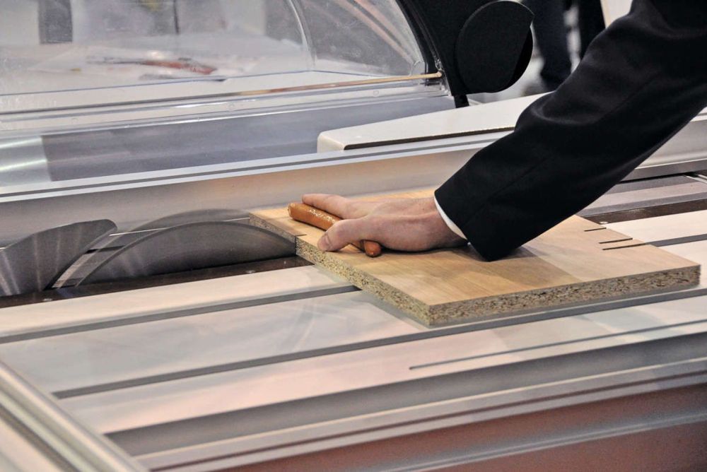 Gleich nebenan, im Ausstellungsbereich der Ineichen AG, zeigt de Lorenzo auf die Tischkreissäge «Unica-Safe» von Griggio: «Das muss man einfach mal gesehen haben, wie das Sägeblatt zurückschnellt, sobald es das Wienerli berührt.» Die Säge misst die elektrische Leitfähigkeit des Materials und löst einen Öldruckzylinder aus, falls jemand mit der Hand an das Blatt gerät. Für das Sägen von Metallen oder anderen leitfähigen Materialien kann die Funktion ausgeschaltet werden. Die «Unica-Safe» hat auch die Jury des Innovationspreises Holz überzeugt: Sie hat der Maschine den ersten Preis verliehen (siehe SZ 41/2016).
