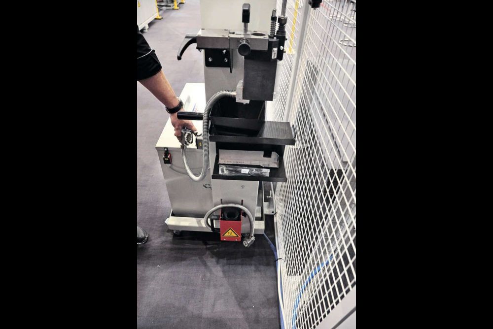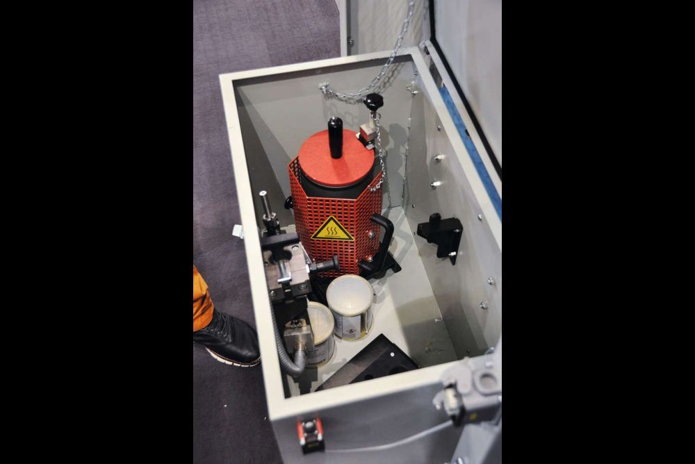 Am Stand der Arthur Bründler AG steuert de Lorenzo auf die grosse Kantenanleimmaschine von Ott zu. Dort interessiert er sich aber nicht für die Maschine, sondern für einen speziellen Rollwagen, der daneben steht. In einem klimatisierten Behälter können dort das PU-Leimaggregat und das Becken aufbewahrt werden, ohne dass sie vorher gereinigt werden müssen.