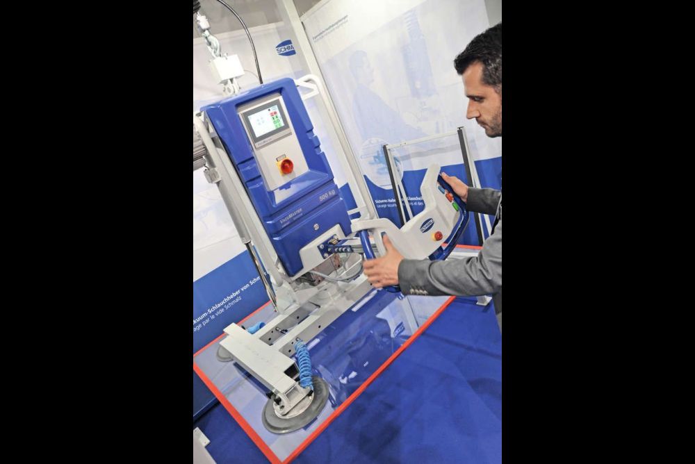 Vis-à-vis zeigt der Vakuumtechnik-Spezialist Schmalz einen neuen Vakuumheber. «Das müssen wir uns auch anschauen», sagt Giovanni de Lorenzo. «In vielen Schreinereien werden solche Handlingsysteme immer öfter thematisiert.» Das hier gezeigte System hat eine integrierte Vakuumpumpe, einen Touchscreen und verfügt über verschiedene Sensoren. So überwacht die Elektronik permanent den Unterdruck und schaltet die Pumpe erst wieder an, wenn ein bestimmter Wert unterschritten wird. Dadurch kann viel Energie gespart werden. Ausserdem misst das System auch gleich das Gewicht der angesaugten Last, die horizontal und vertikal stufenlos geschwenkt werden kann. Die Elektronik blockiert dabei automatisch jene Funktionen, die zu einer Gefahr führen könnten, und zeigt dies auf dem Bildschirm an. Zum Beispiel kann das Werkstück erst gelöst werden, wenn es vollständig abgesetzt wurde und das System somit entlastet ist. Ein versehentliches Lösen der Sauger ist dadurch ausgeschlossen.