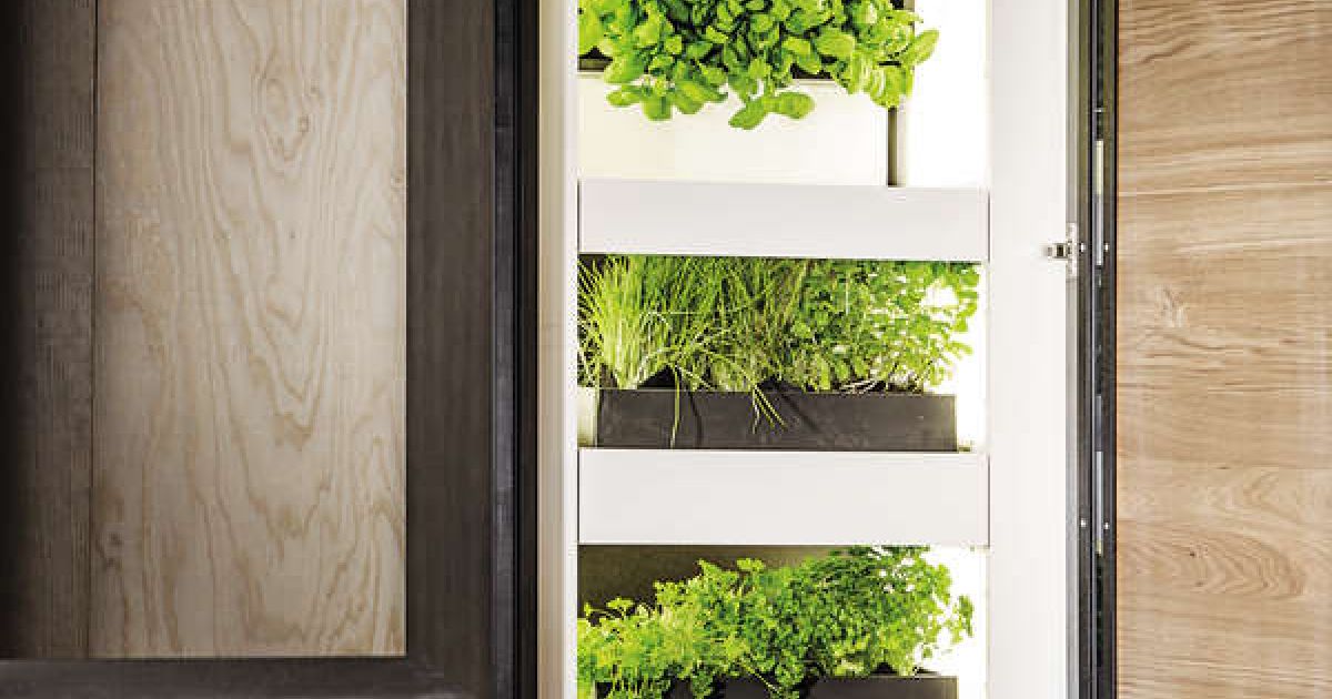 Der Wachstumsschrank mit stets frischen Kräutern schaltet beim Öffnen vom Pflanzenlicht auf ein Gebrauchslicht um. Geschlossen, bleibt am Rand ein farbiger Lichtstreifen sichtbar. Bild: Michael Liebert