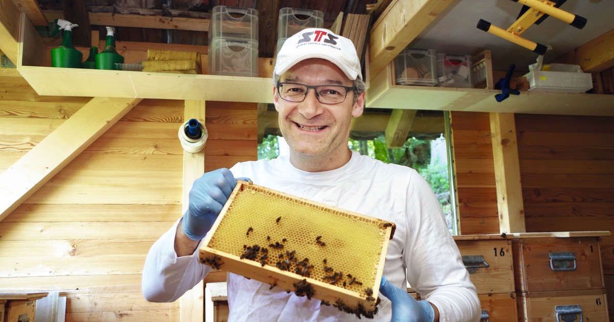 Und offensichtlich ist es bei der Imkerei auch noch ein Vorteil, wenn man Schreiner ist. Sowohl das Bienenhaus als auch die einzelnen Bienenkästen hat Lüthi selbst gemacht. Und während er noch betont, dass er die Imkerei nur mit Unterstützung und Wohlwollen seiner Familie betreiben kann, ist er am Bienenhaus angekommen. Im Nu umhüllt ihn ein Gesumme, ein Gebrumme. Eine Biene fliegt ihn schnurstracks an, macht dann kehrt. «Oh. Das wirkte eben gar nicht freundlich. Schnell rein, bevor sie Verstärkung holt», sagt er, betritt das Hüttchen, atmet auf. Drinnen hängt an einem Haken die Imkerbluse, doch in der Regel lassen ihn die Tierchen in Frieden, wenn er helle Kleidung trägt, die Haare unter einem Hut versorgt, auf Duftwässerchen verzichtet und keine zappeligen Bewegungen ausführt. Lüthis Bienen machen einen munteren Eindruck.