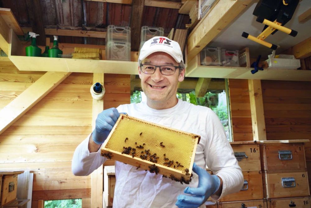 Die Jungen umschwirren den Eingang des Stocks, um sich ihren Standort einzuprägen, während die Älteren Pollen und Nektar sammeln und Wasser herbeitragen. Lüthi bildet sich zurzeit zum «Imker mit eidgenössischem Fachausweis» weiter, seine Imkerei ist mit dem Goldsiegel zertifiziert. Das bedeutet, dass er sich an die strengen Qualitätsvorgaben des Vereins deutschschweizerischer und rätoromanischer Bienenfreunde hält.