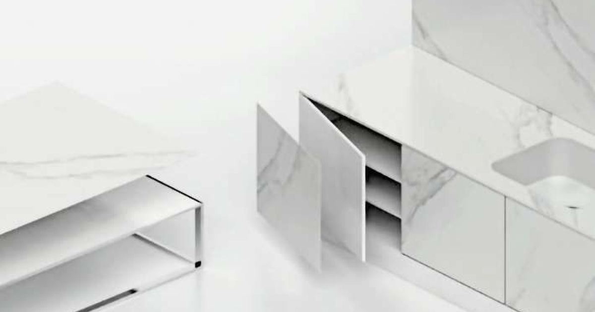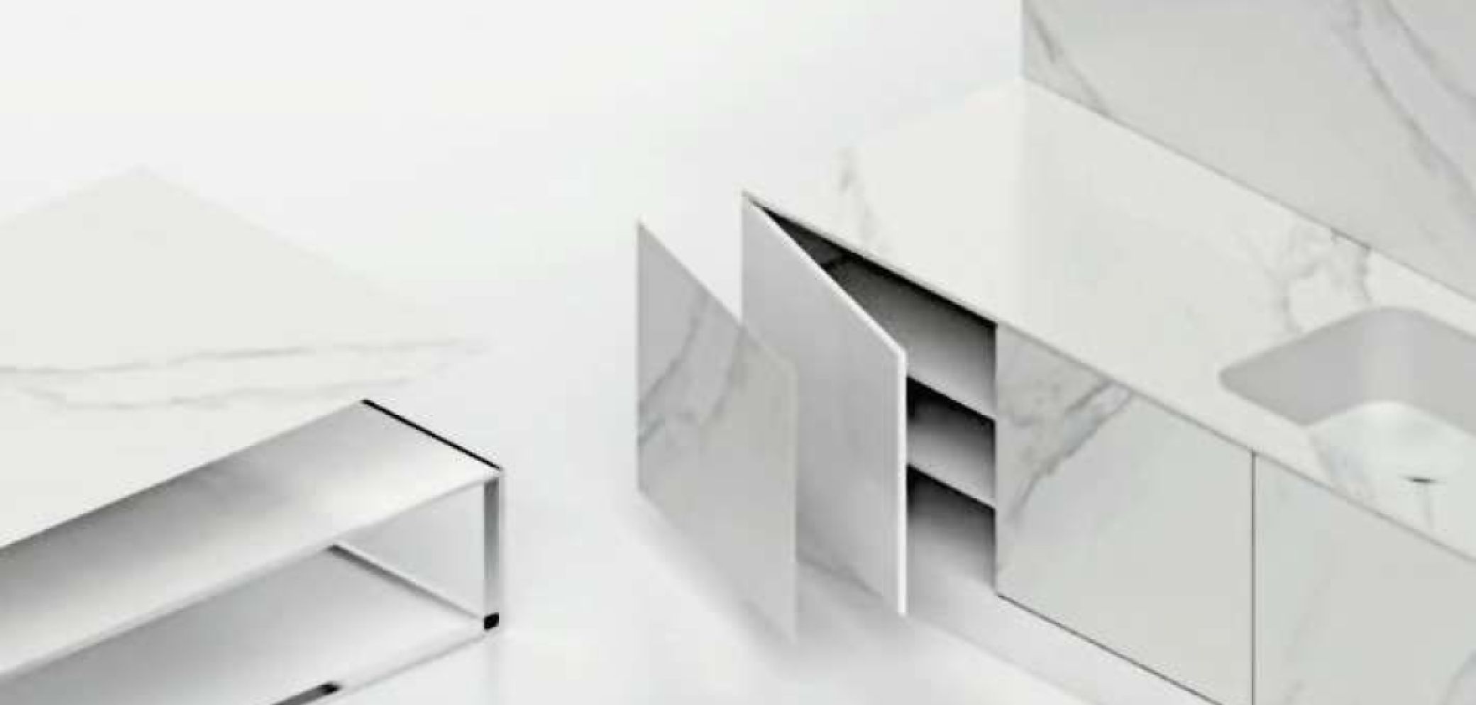 Mit einer Stärke von nur 4 mm und einem Gewicht von 10 kg/m2 ist die steinartige Platte «DKTN by Cosentino Slim» für Pro- jekte geeignet, die leistungsstarke und dennoch leichtgewichtige Materialien erfordern. Gemäss Hersteller Cosentino ist die Oberfläche dank eines besonders verdichtenden Verfahrens sehr kratzfest, fleckenabweisend und hitzebeständig und widersteht der UV-Strahlung. Zudem überzeugt das neue Modell durch geringe Wasserabsorption und kann sogar als Einzelstück produziert werden. Nachahmungen verschiedenster Natursteine sind möglich. Die Bearbeitung erfolgt mit Werkzeugen, wie sie im Fliesenbereich Verwendung finden, und soll durch das Fehlen innerer Spannung sehr einfach sein. Die Platte ist im Format 3200 × 1440 mm erhältlich und eignet sich auch für die Verkleidung von Möbeln, Türen oder grossen Paneelen.