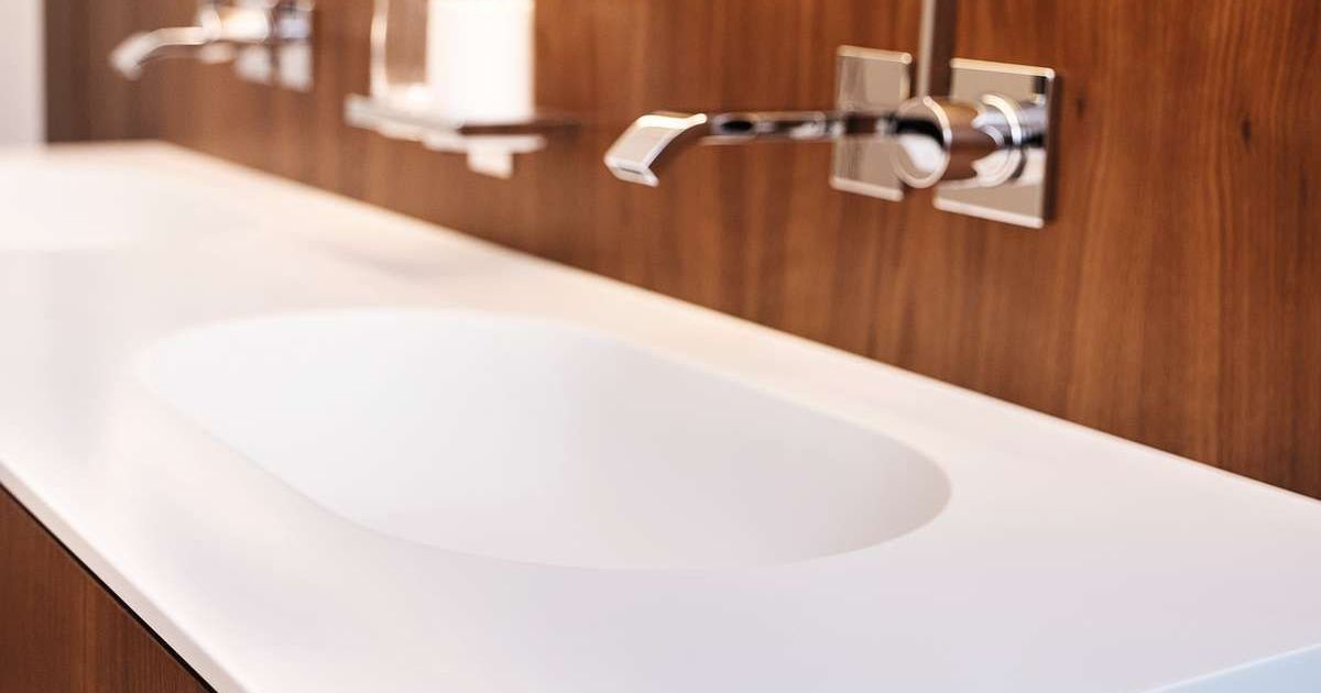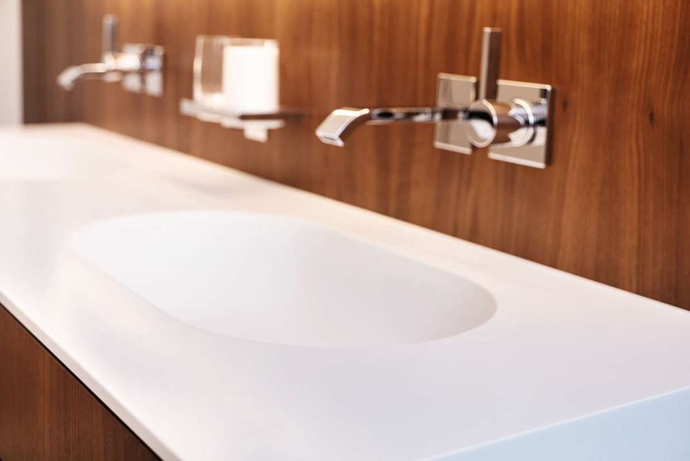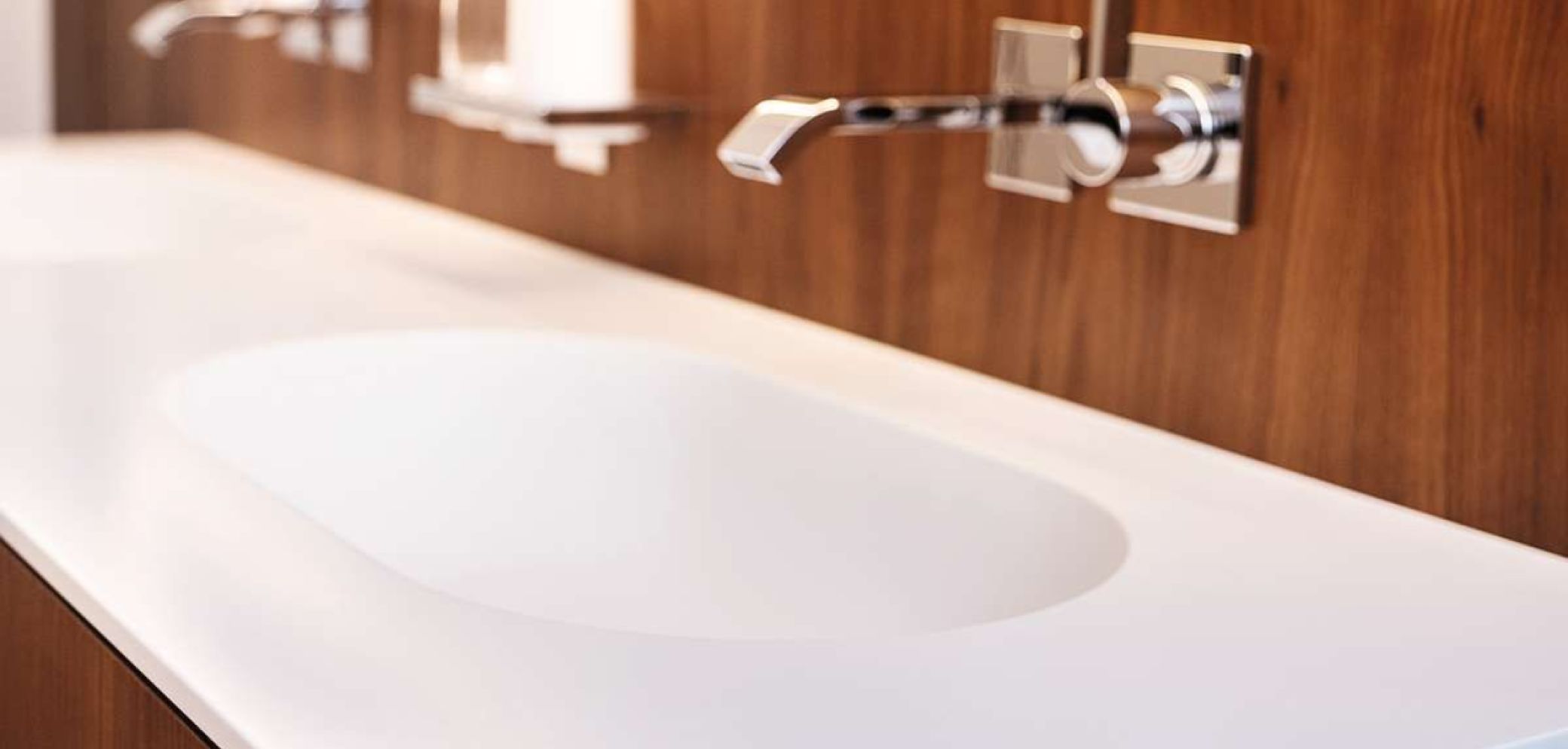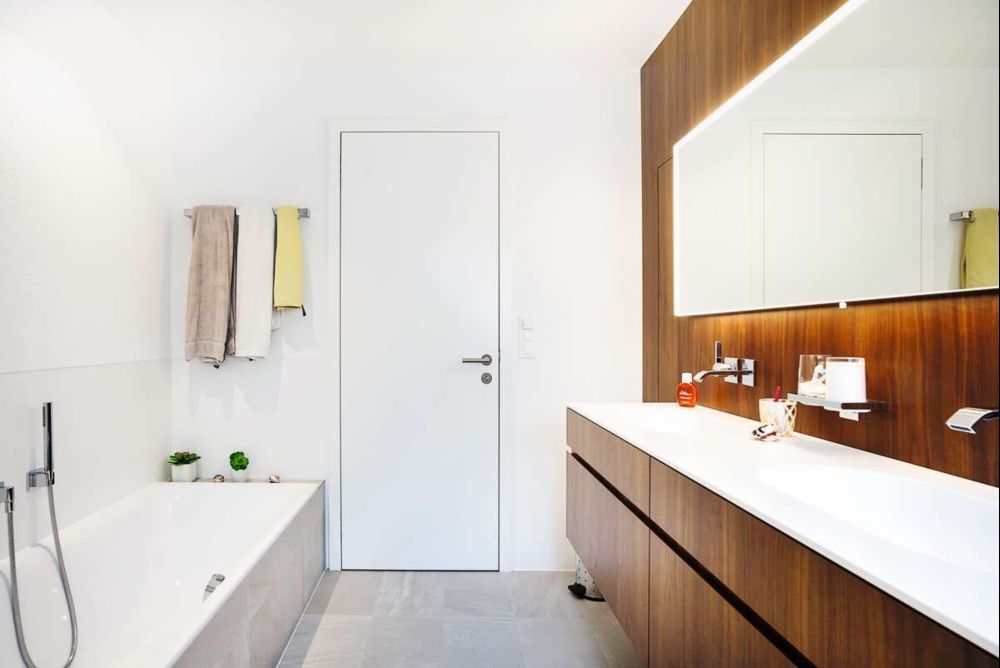 Da es sich beim Badezimmer um einen Feuchtbereich handelt, kam eine wasserfeste Spanplatte zum Einsatz, die mit dem amerikanischen Nussbaum furniert und anschliessend natur lackiert wurde. Zusätzlich wurde an den Kanten und den Griffprofilen massiver Nussbaum verarbeitet. Die Becken und die Arbeitsplatte bestehen aus Corian «Glacier White» und setzen einen schönen Kontrast zum Nussbaum.