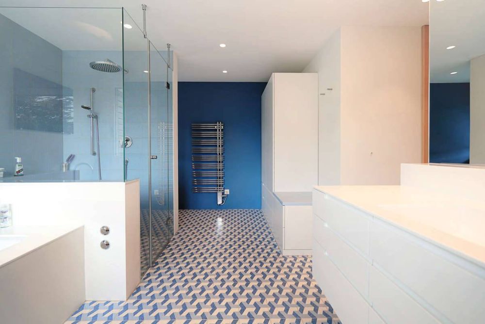 Die zwei typengleichen Badezimmer in einem umgebauten Einfamilienhaus aus den 1960er-Jahren in Küsnacht ZH stehen auf unruhigem Boden. «Die Bodenplatten sind ganz klar das bestimmende Element, der Blickfang in diesen Räumen», sagt Reto Weiss, Inhaber und Geschäftsführer der Weiss Innenausbau AG in Samstagern ZH. Die lebendige Bodengestaltung, vom Architekten vorgegeben, verlangte vom Schreiner einige Zurückhaltung. «Die Badmöbel durften den Boden nicht mit einer auffallenden Gestaltung konkurrenzieren, sondern mussten sich zurücknehmen, da sonst eine Unruhe entstanden wäre.» Die Schreinerei löste das Problem mit weiss gespritzten Möbeln aus MDF, die Abdeckungen von Badewanne und Waschtisch bestehen aus Hi-Macs. «Wir mussten eine saubere Möbelarchitektur ganz ohne Schnörkel realisieren, das war sicher die Spezialität bei diesem Umbau», sagt Weiss.