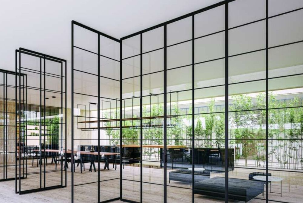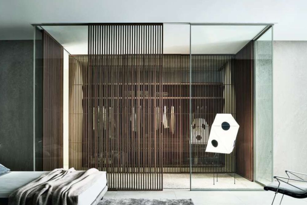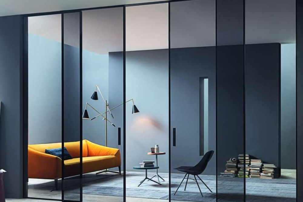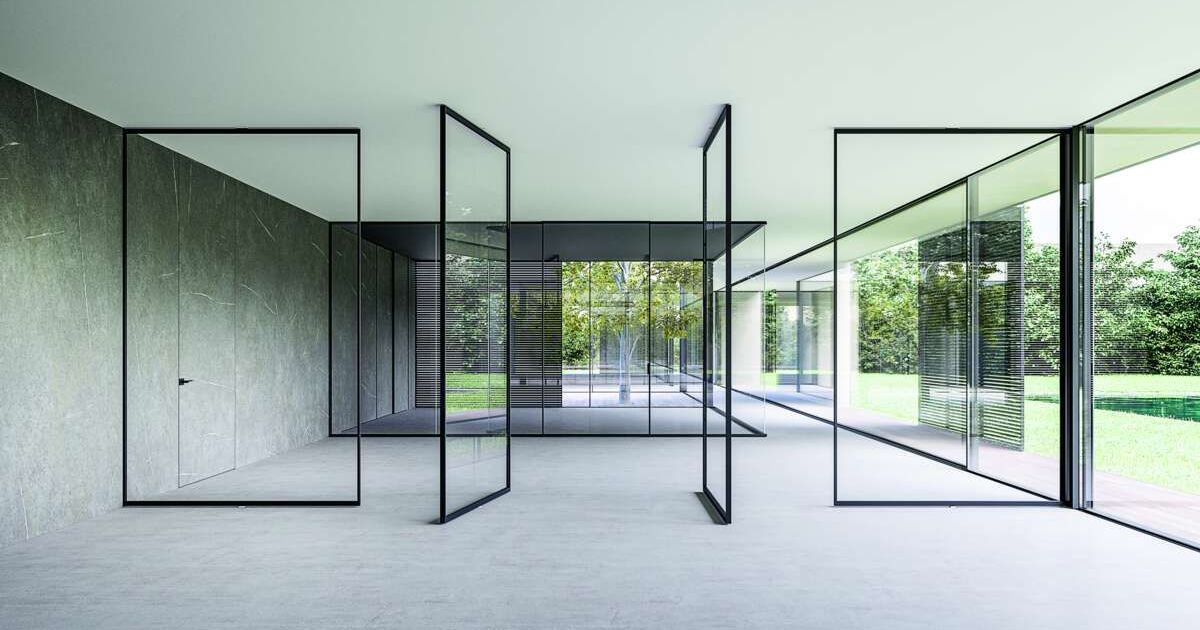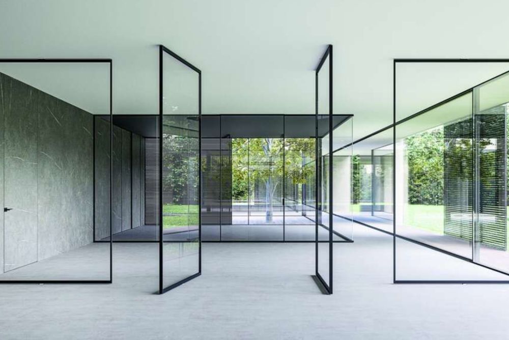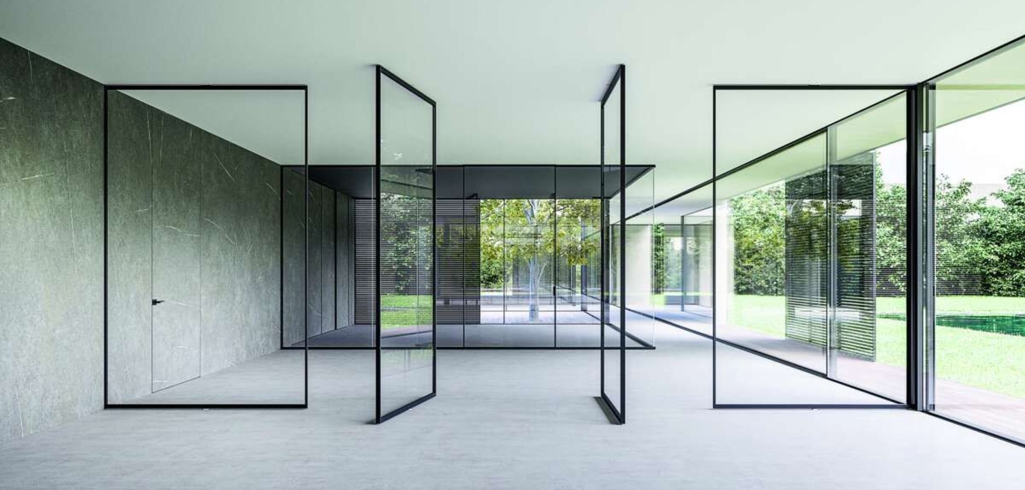 Im Kern geht es dabei um grossformatige Glaselemente mit äusserst filigranen Rahmen aus Aluminium. Die Elemente können verschiedenste Materialien, Formate und auch Funktionsweisen haben. Teile zum Schieben, feststehende Elemente und solche, die als Dreh- oder Pivottüren ausgebildet sind. Sind die Elemente transparent, lässt sich das Ensemble mit einer zusätzlichen Schiene ausstatten, die dann einen Sichtschutz aufnimmt, wie etwa Rahmen mit Lamellen. Oder aber man spielt mit halbtransparenten Scheiben, die dann Inlays aus Gewebe oder Stoff haben. So erhält ein Raum mehr Privatsphäre, ohne diesen optisch zu verschliessen. Solche spielerischen Elemente, mit dem sich wandelbare Raumwirkungen erzeugen lassen, werden in der Innenarchitektur immer beliebter.