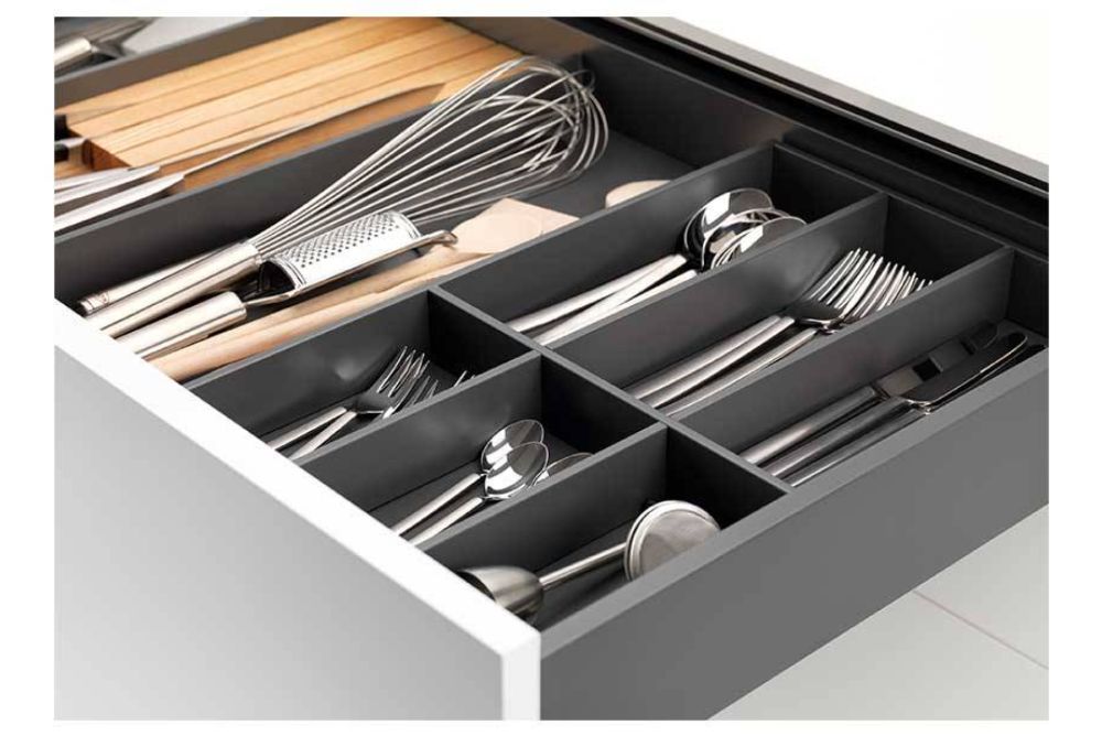 Die jüngste Entwicklung für die Tavinea Reihe ist Tavinea Sorto, ein Inneneinteilungs-System für die Organisation in Besteck- oder Kleinteilschubkästen. Tavinea Sorto besteht aus zwei Rahmen (B186 und B276) und einer Traverse. Die Rahmen sind ohne Boden und können ohne Antirutschmatten im Schubkasten positioniert werden. Dabei wird der entstehende Freiraum zwischen den Rahmen aktiv genutzt. In Kombination mit dem passenden Zubehör und der Traverse entsteht so eine perfekte Organisation im Schubkasten.