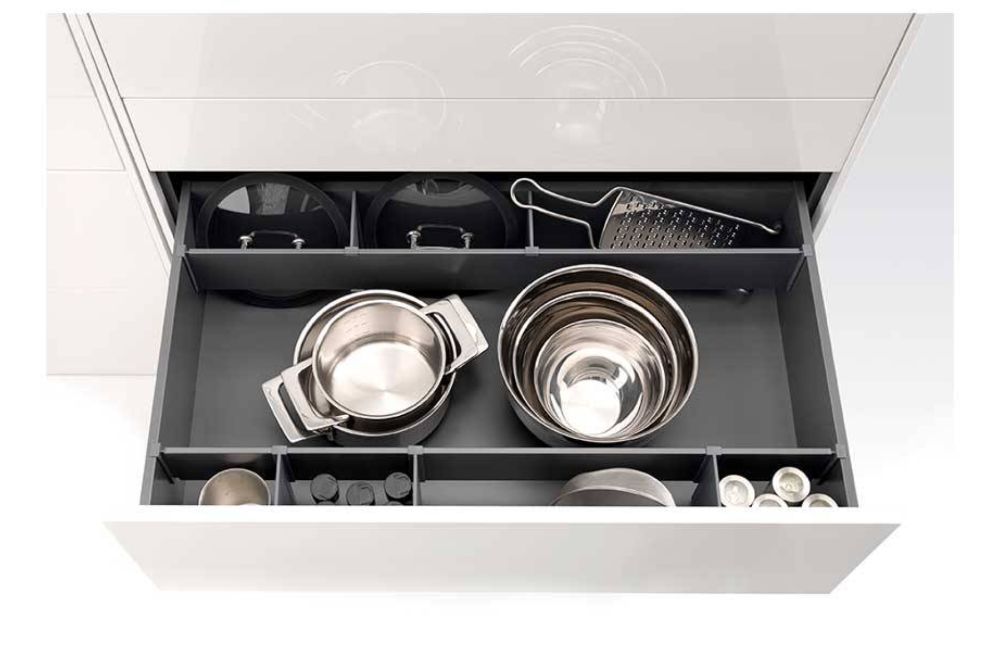 Das Unterteilungs-System Tavinea Optima ordnet die Frontauszüge der Schubkasten-Systeme Nova Pro Scala und Vionaro. Die schlanken Unterteilungsprofile können flexibel und stufenlos im Auszug platziert werden und geben in Kombination mit den optionalen Smartboards dem grossen Staugut wie Töpfen und Tellern einen sicheren Halt. Mit Tavinea Optima ist die Einteilung maximal flexibel: Das System ist werkzeuglos verstellbar und kann jederzeit nachgerüstet werden.