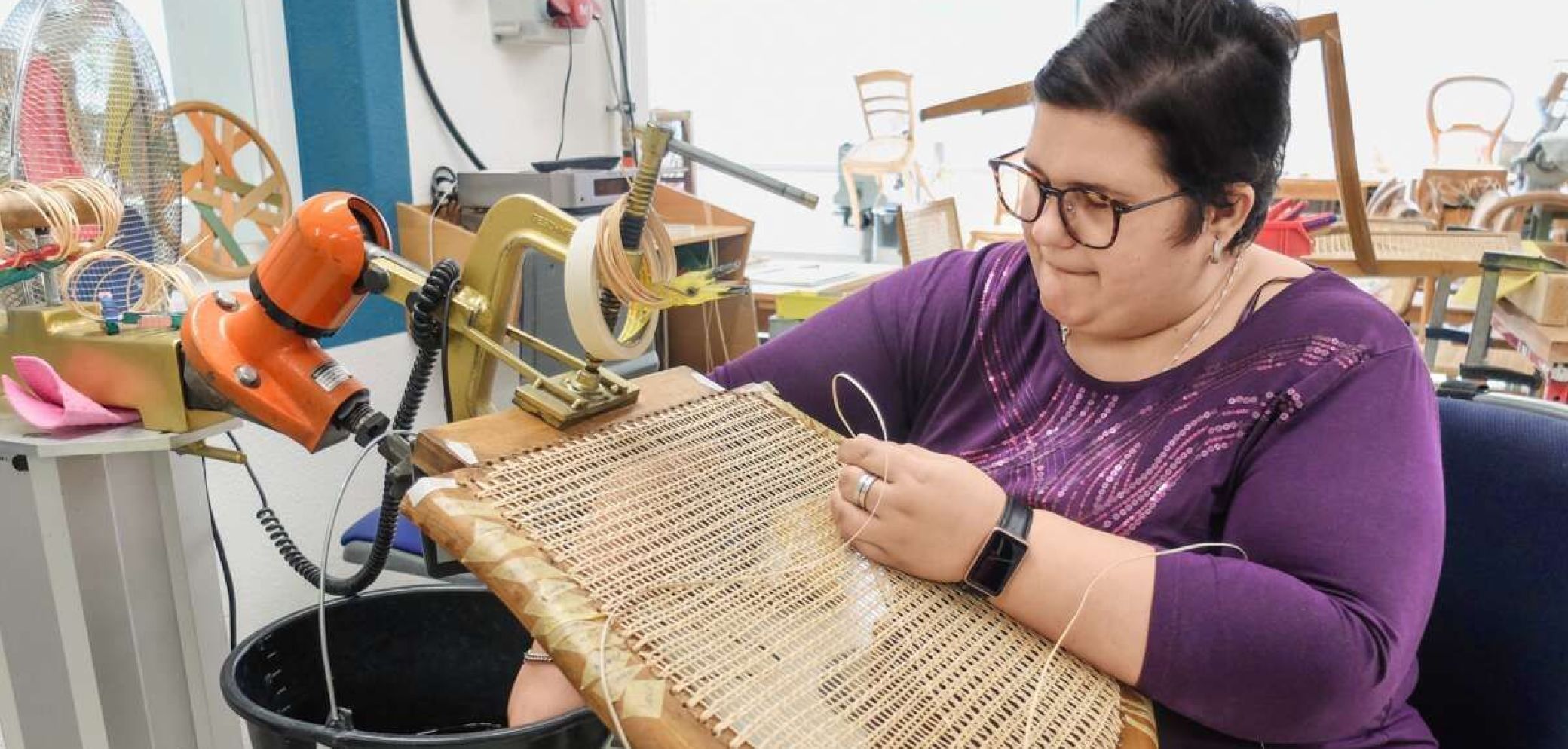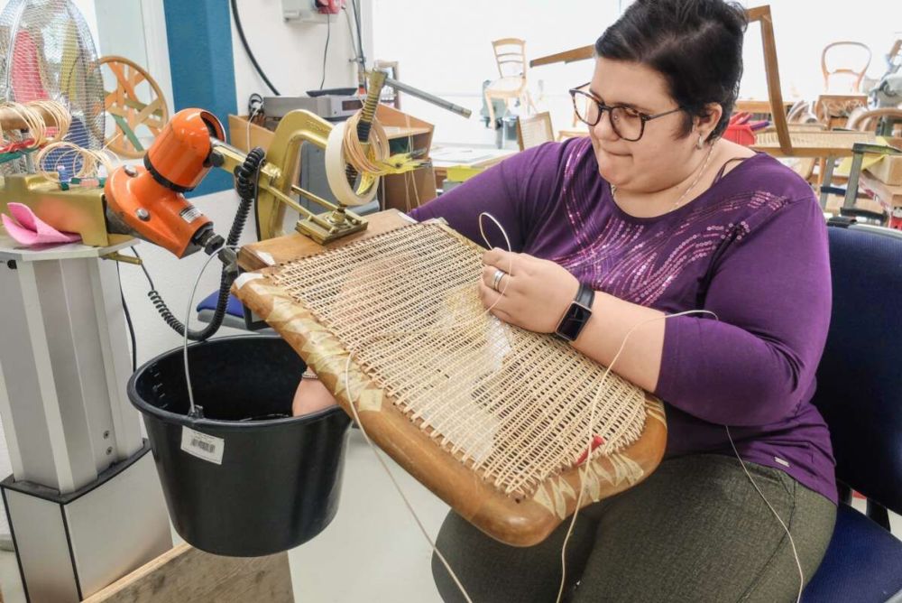 Eine Beschäftigte der Brühlgut Stiftung Winterthur flicht eine sich verjüngende Stuhllehne. Hier zahlt sich jahrzehntelange Erfahrung aus. Bild: Stefan Hilzinger