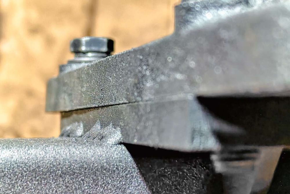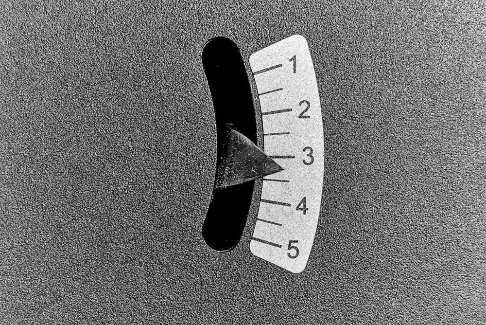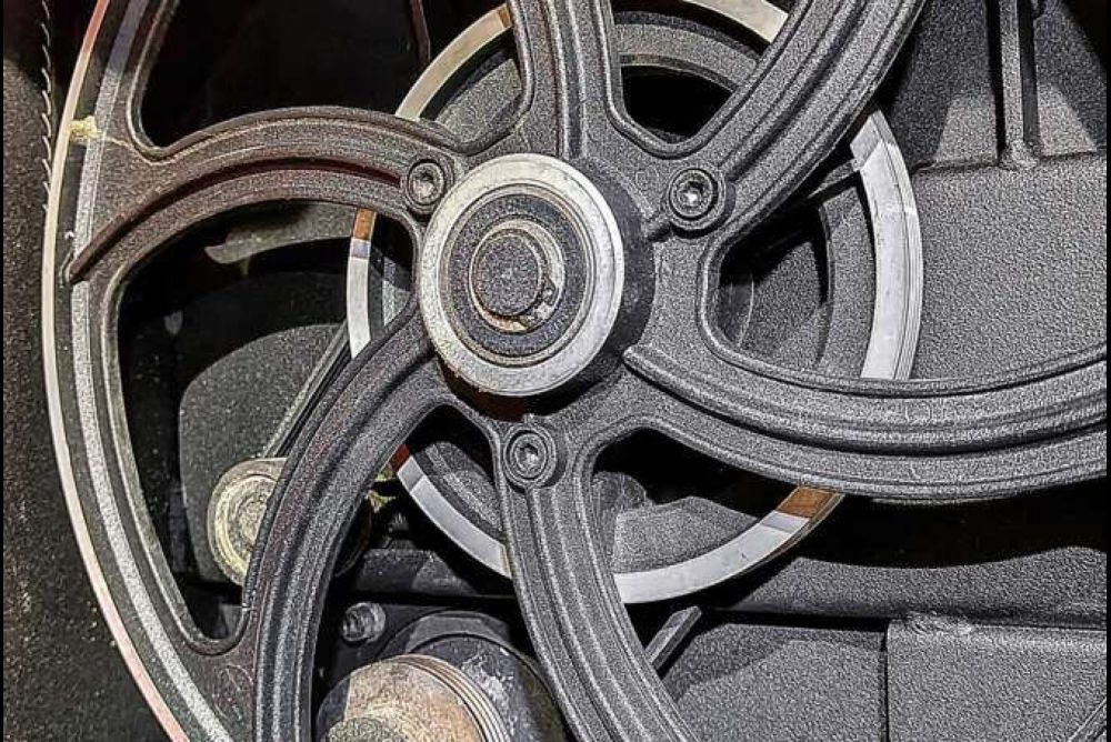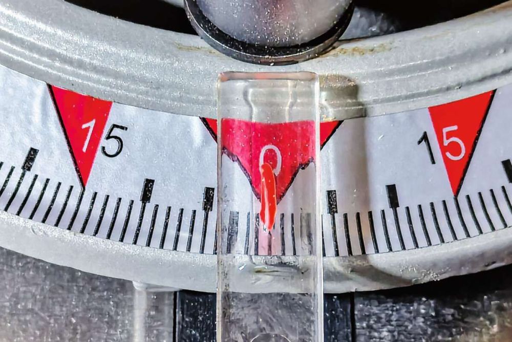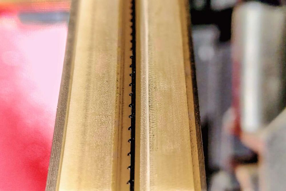Dann beginnt die Einstellarbeit. Der Tisch muss, ähnlich einem Zifferblatt, das vor einem auf dem Tisch liegt, richtig positioniert werden. Davor prüfe ich, ob das Bandsägeblatt rechtwinklig zum Tisch steht. Die Neigung lässt sich über vier Innensechskant-Schrauben am Flansch einstellen. Um die Position des «Zifferblattes» auszurichten, sägt man mit dem Winkelanschlag in exakt 90°-Einstellung Probestücke mit grossem Querschnitt. Der Winkel zum Sägeband stimmt, aber der Tisch scheint etwas verdreht wie eine Uhr. Bis das genau eingestellt ist, muss ich die vier Maschinenschrauben recht oft lösen und wieder festziehen, und wieder einen Probeschnitt durchführen und wieder und noch ein paar.