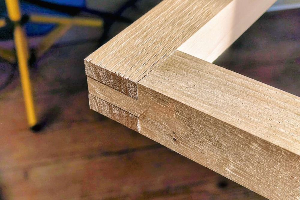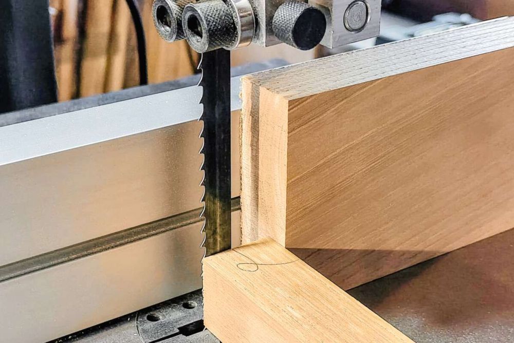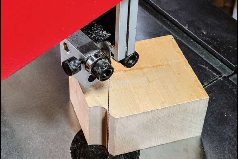 Wie so viele Schreiner, kenne ich die Bandsäge vor allem vom Brennholzsägen und vielleicht von einem Schweifschnitt. Deshalb bin ich gespannt auf das Sägen von Schlitz und Zapfen. Ohne Massband stelle ich die Säge ein und bin erstaunt über die Genauigkeit des Resultats. Das Einsägen längs zur Faser und auch das Absetzen des Zapfens gelingen sauber. Anstatt den Schlitz auszustemmen, entscheide ich mich für das Ausräumen mittels Sägeblatt. Dazu macht man eng nebeneinanderliegende Schnitte, und das, was dann noch da ist, kann man durch leichtes Verkanten des Holzes ausräumen. Man muss nur darauf achten, das Holz stets sauber am Anschlag zu halten. Aber es lässt mein Gefühl für die Maschine wachsen. Das Prozedere gelingt nur, wenn das Band stabil und ruhig läuft, sodass es weder am Grund des Schlitzes noch beim Absetzen des Zapfens Schläge durch einen unregelmässigen Bandlauf gibt. Das Ergebnis ist auch hier tadellos.